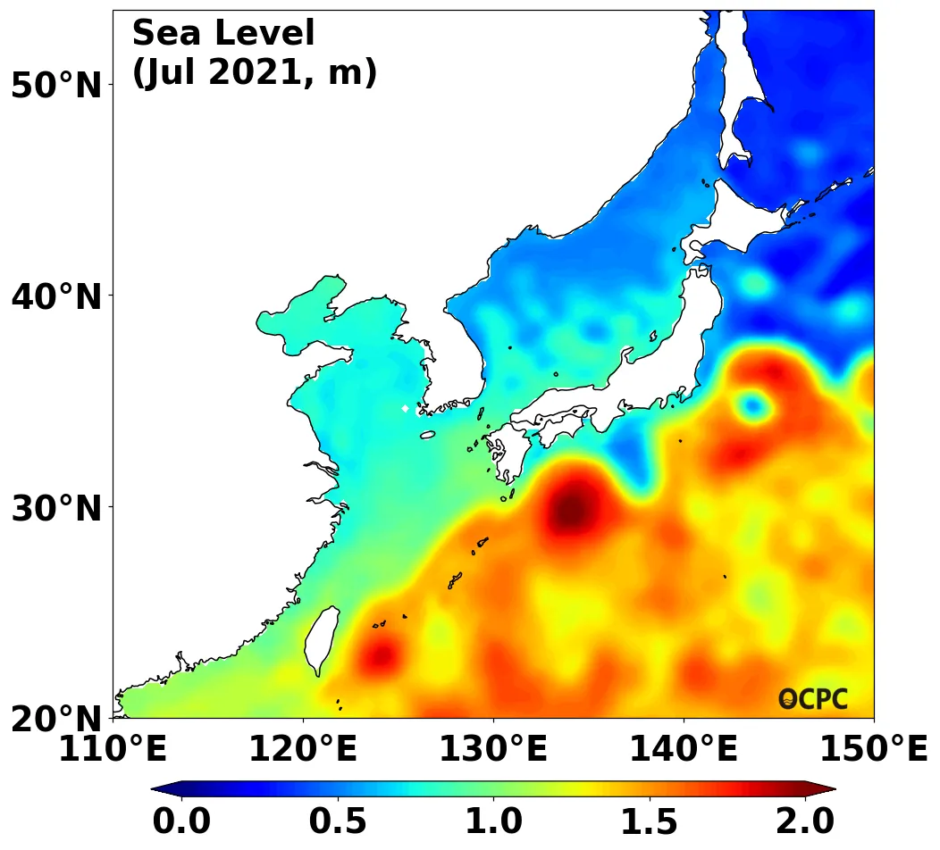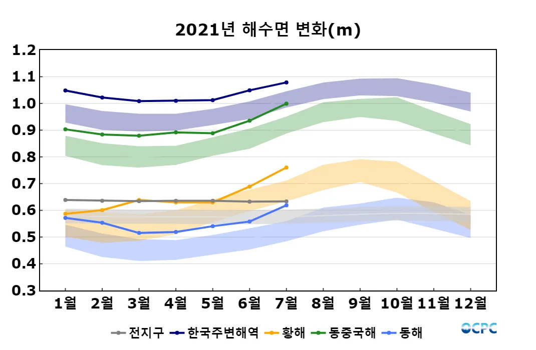 황해, 동해, 동중국해는 평년보다 각각 8.8cm, 9.7cm, 8.0cm씩 높았으며, 이는 모두 최근 28년(1993~2021) 동안 최고 수치입니다.