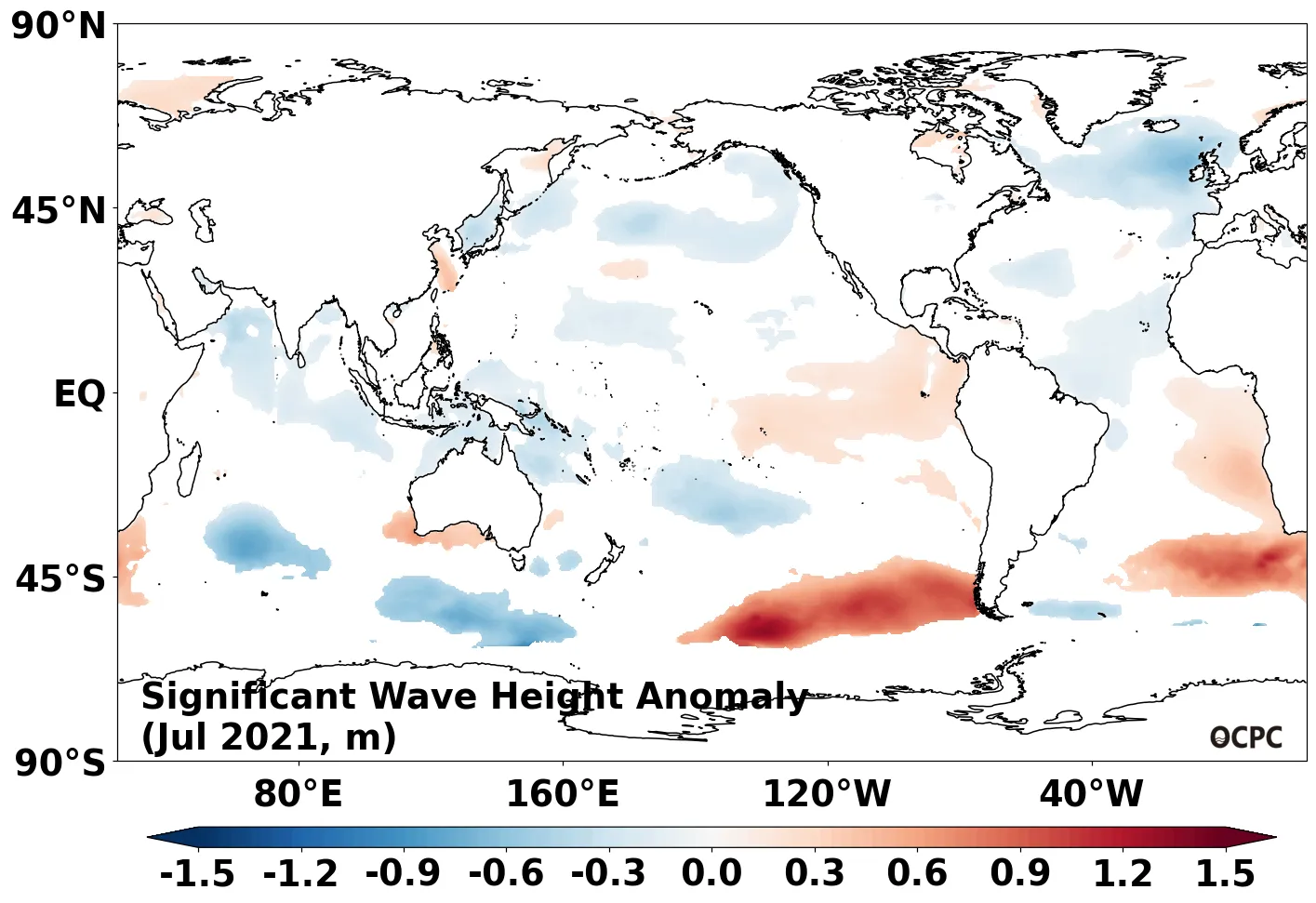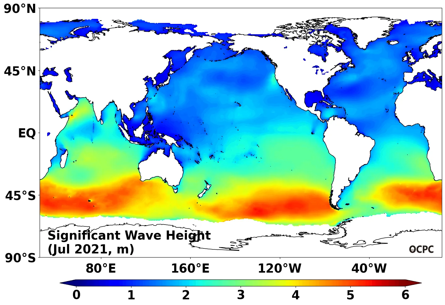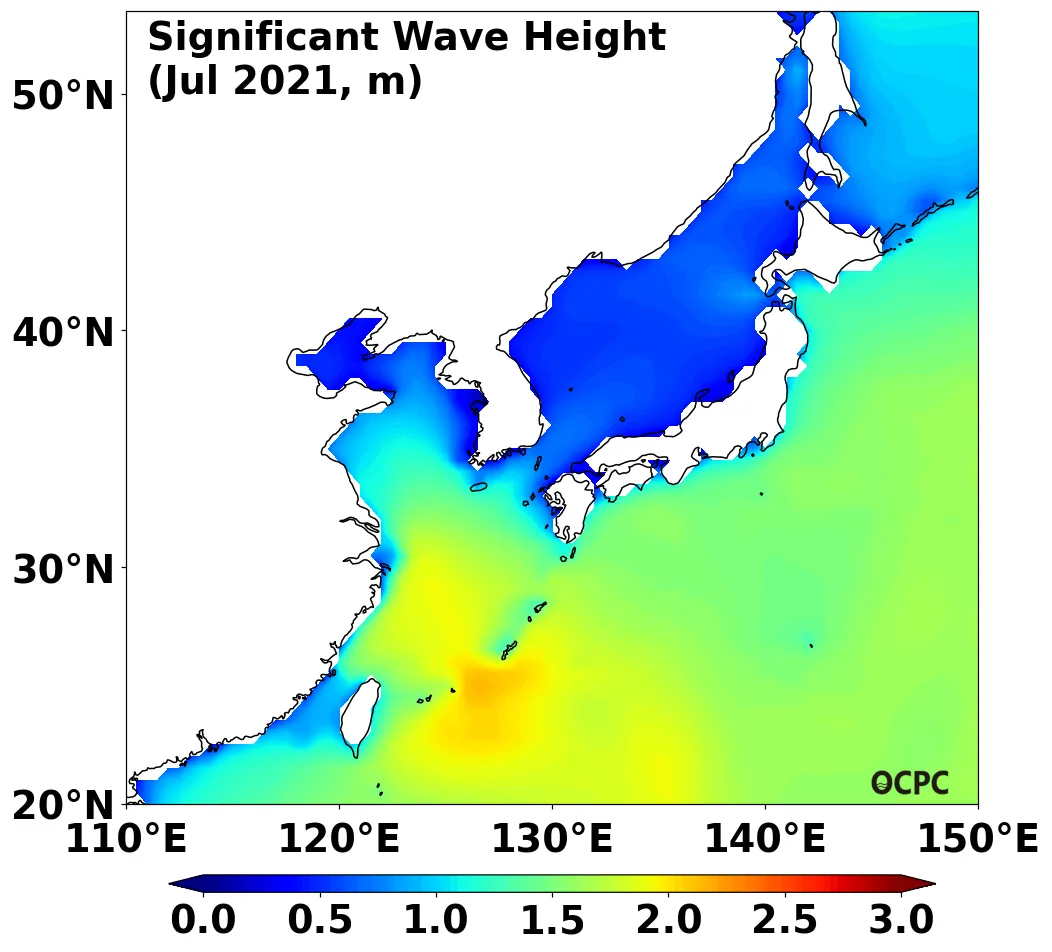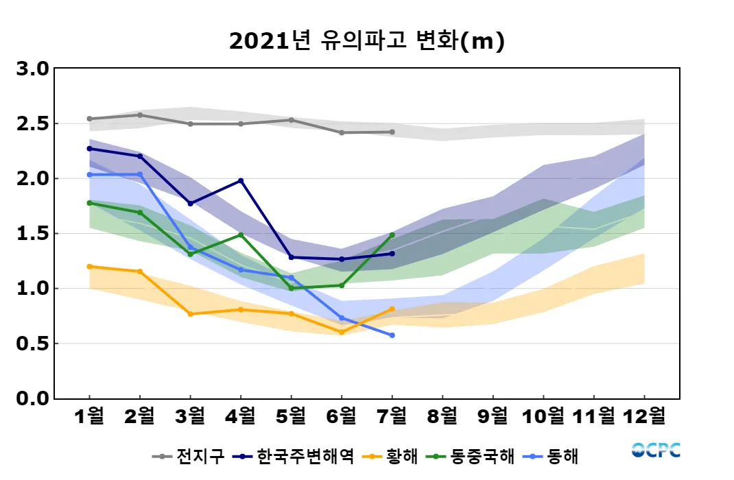 최근 30년 동안 7월의 전지구 유의파고는 10년에 1.2cm씩 낮아지고, 한국주변해역은 0.5cm씩 감소하는 추세입니다.