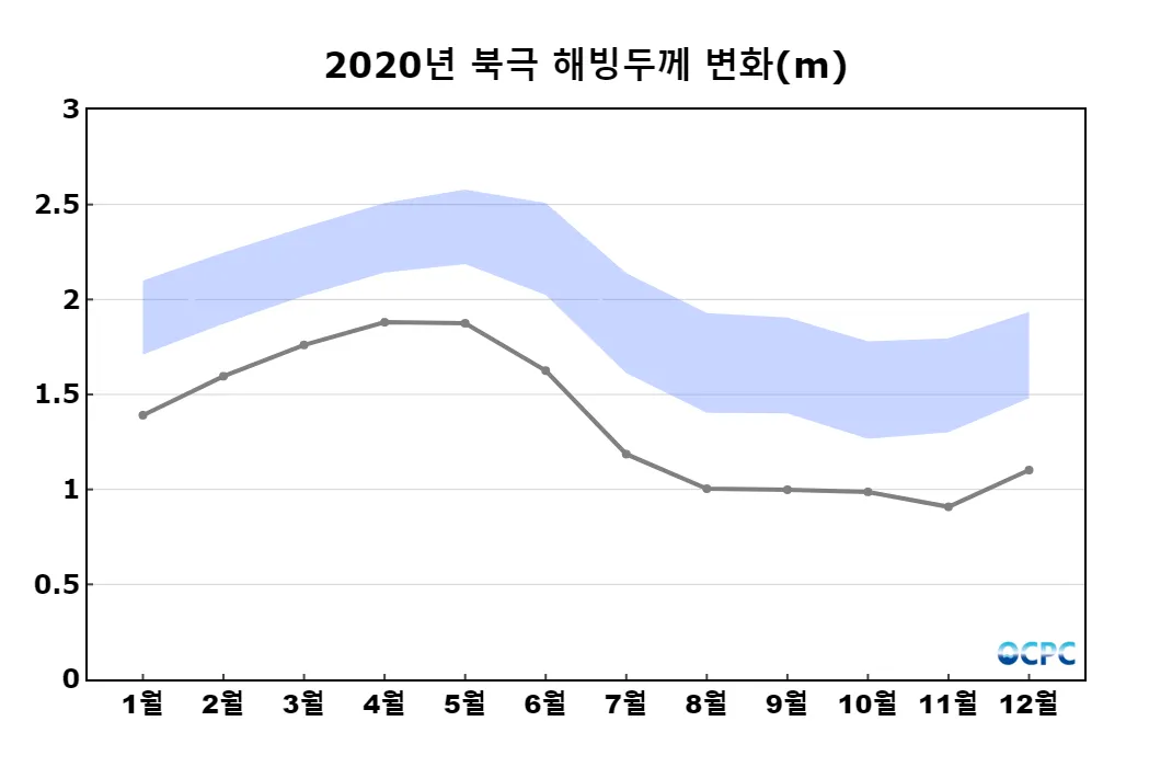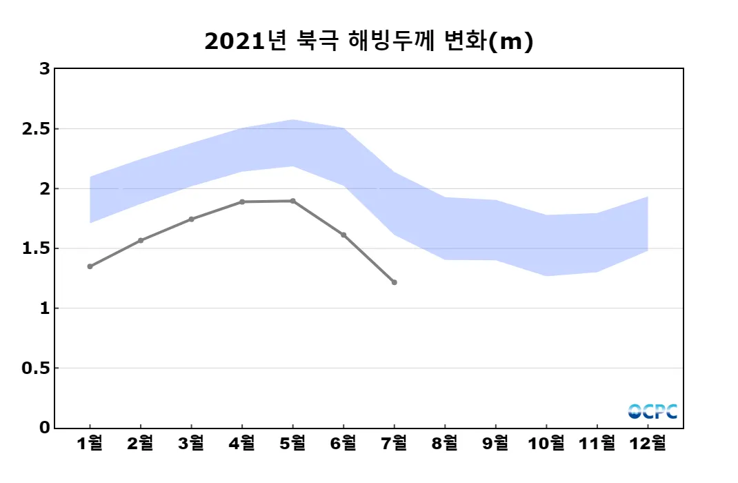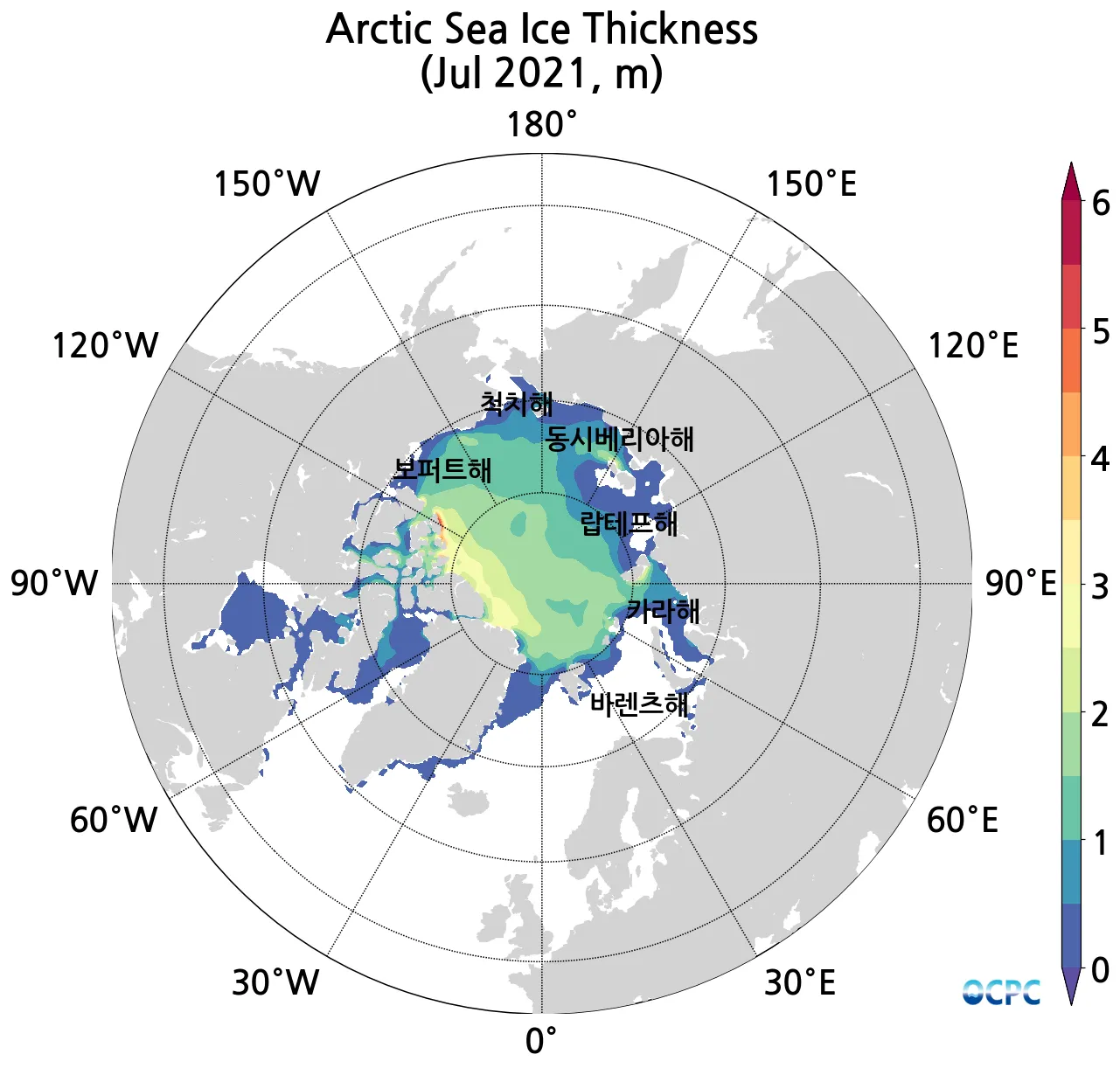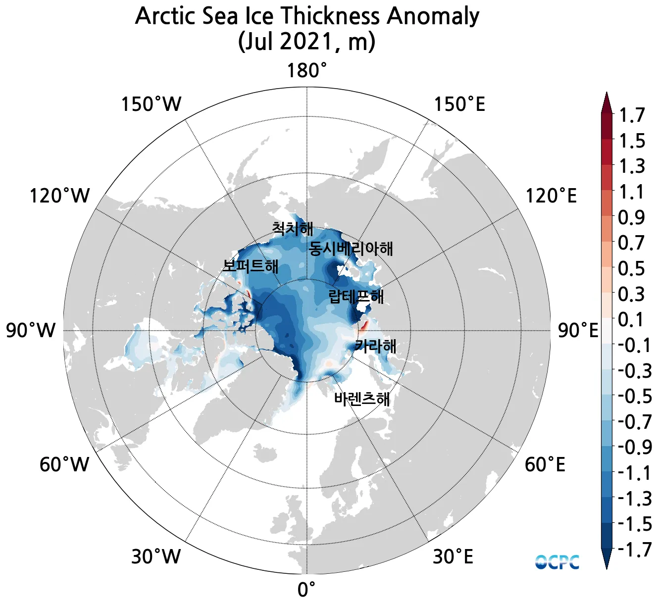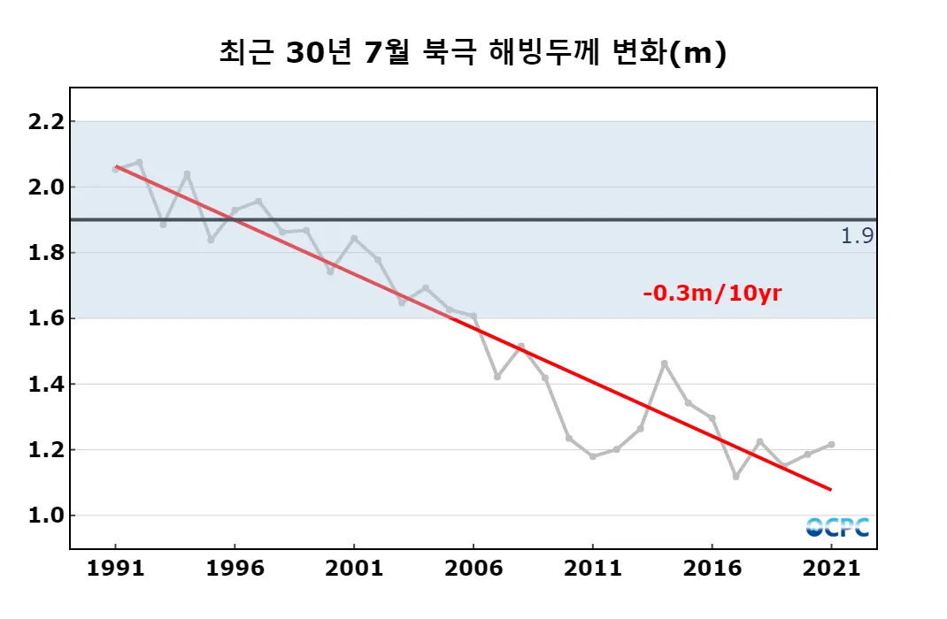 북극 해빙두께는 평년(1.9m)보다 약 0.7m (37%) 얇았으며, 최근 30년 동안 10년에 약 0.3m씩 얇아지는 추세입니다.