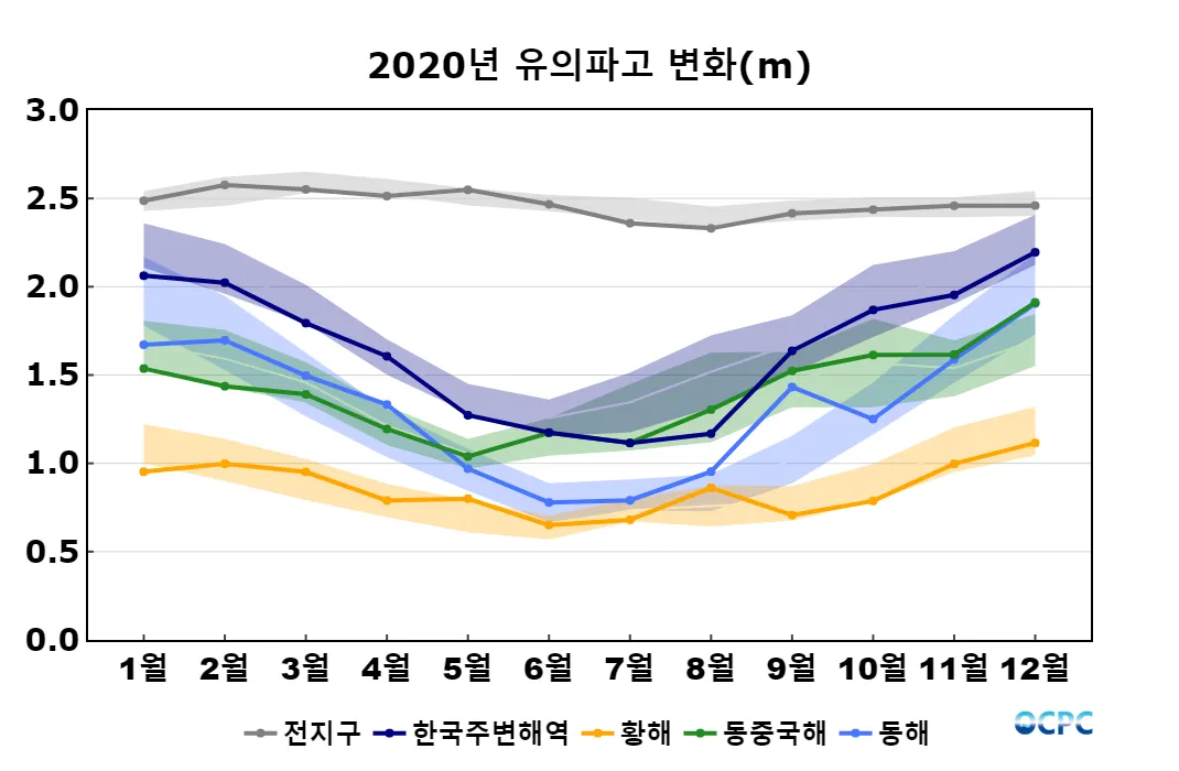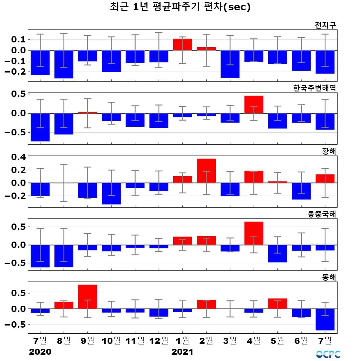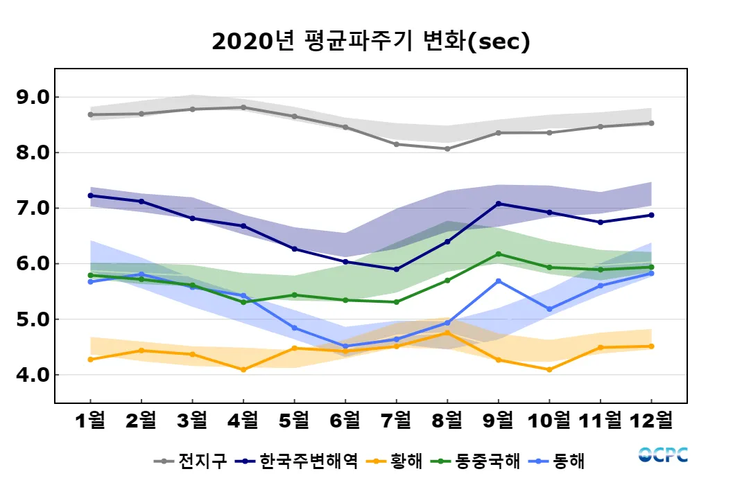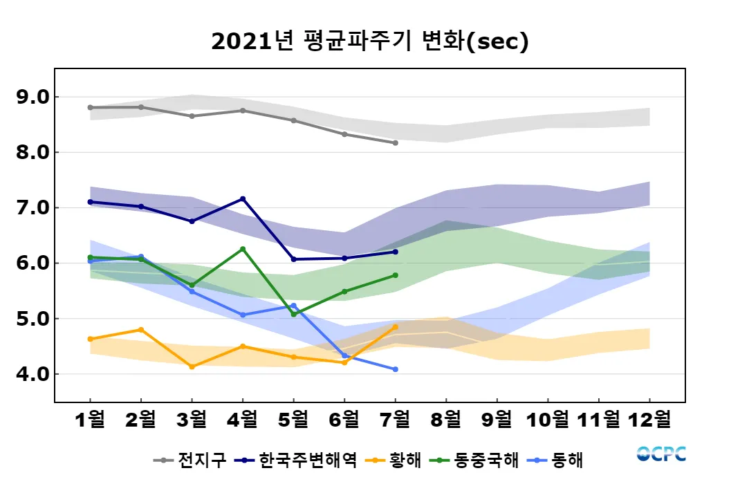 전지구, 한국주변해역, 동해의 평균파주기는 평년보다 각각 0.2초, 0.4초, 0.7초 감소했고, 황해와 동중국해는 평년과 비슷했습니다.