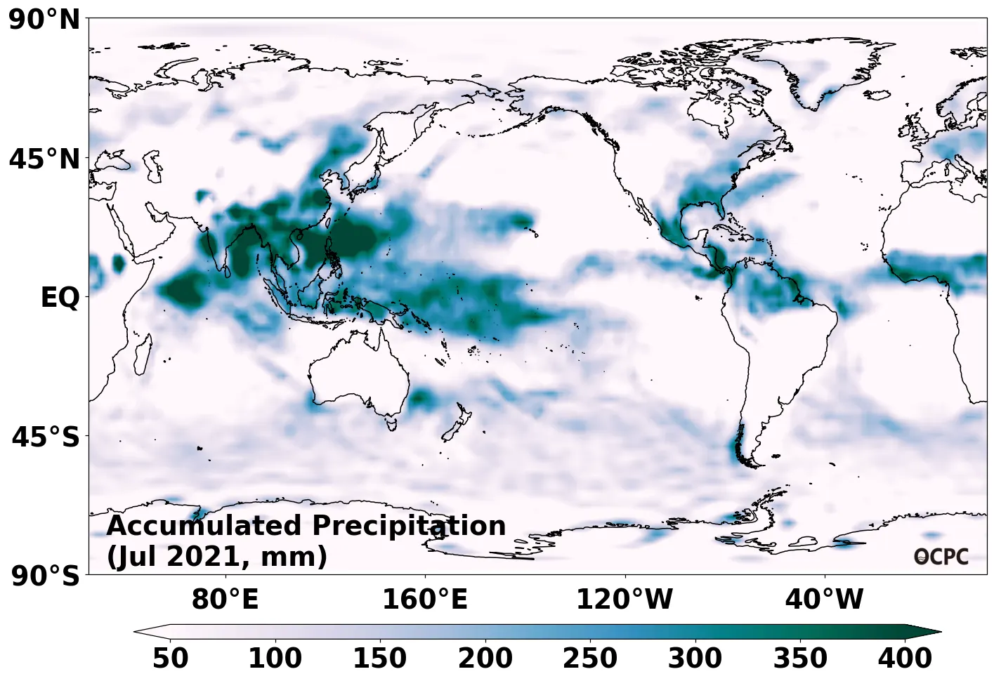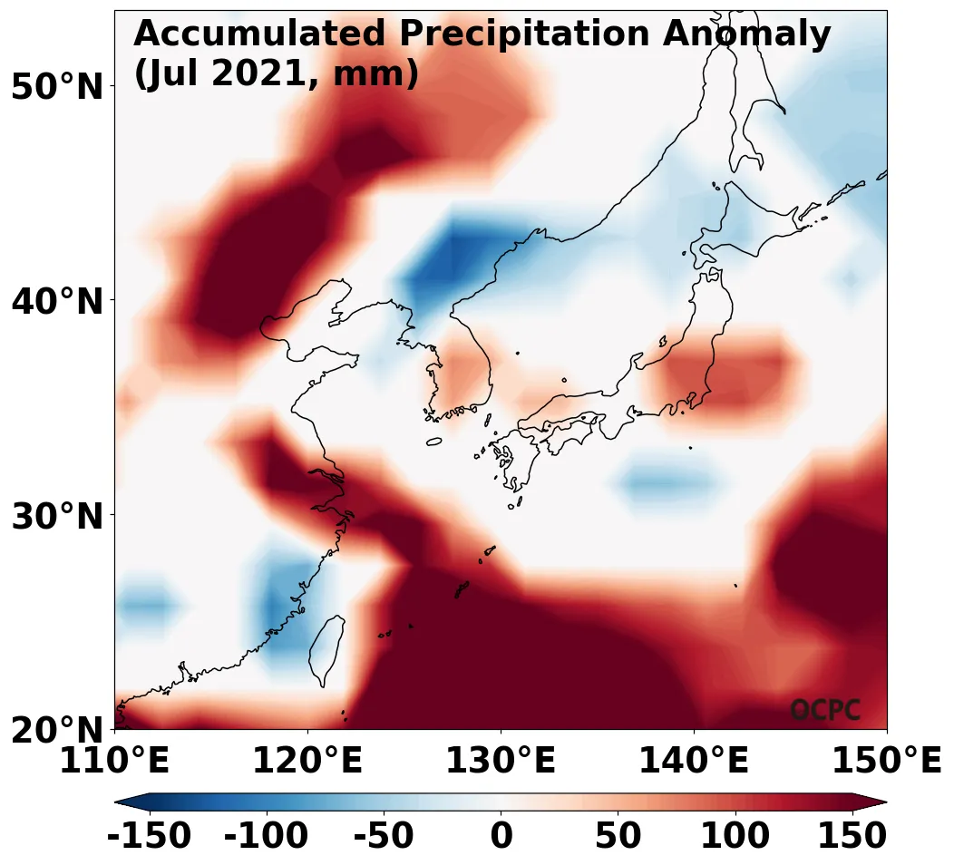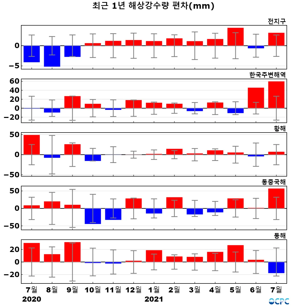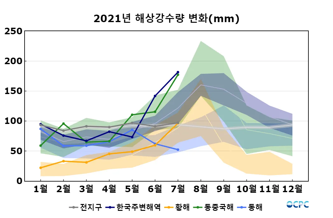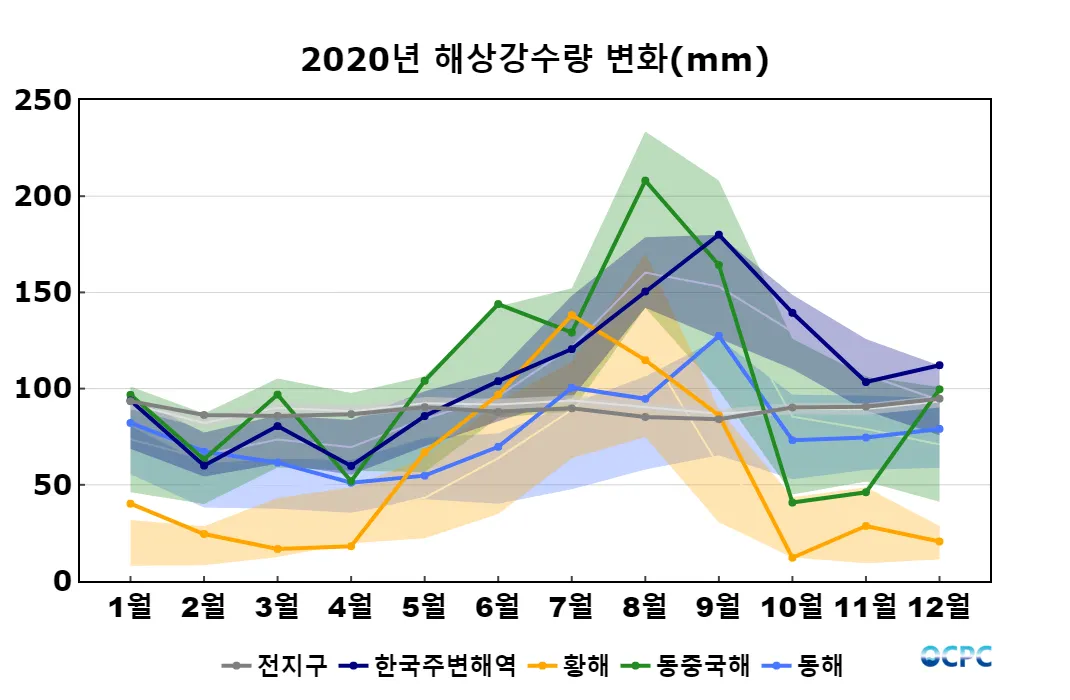전지구, 한국주변해역, 동중국해의 누적 해상강수량은 평년(93.8mm, 121.7mm, 120.2mm)보다 각각 3.2mm, 59.9mm, 57.1mm 많았습니다.