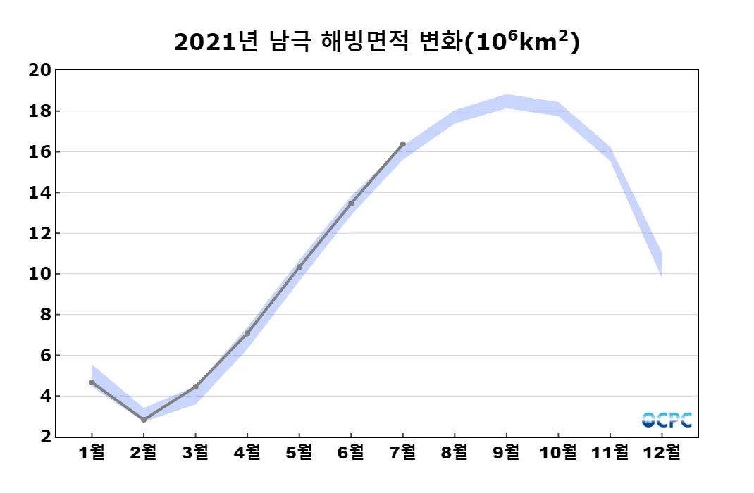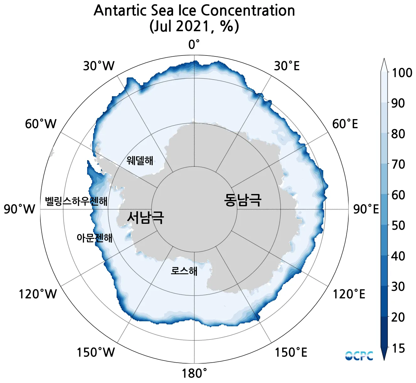 남극 해빙면적은 1638만km²로 평년(1596만km²) 대비 2.6% 증가했습니다.