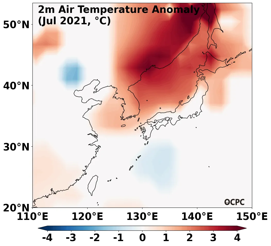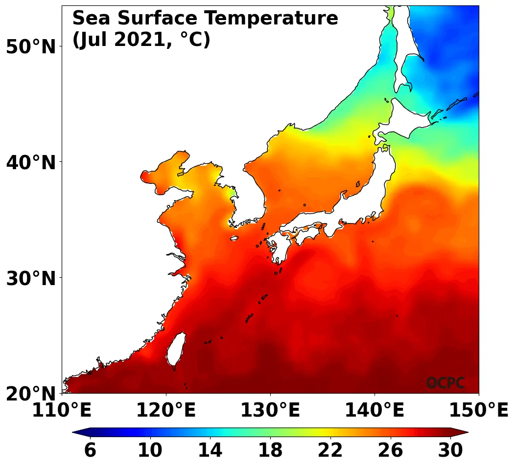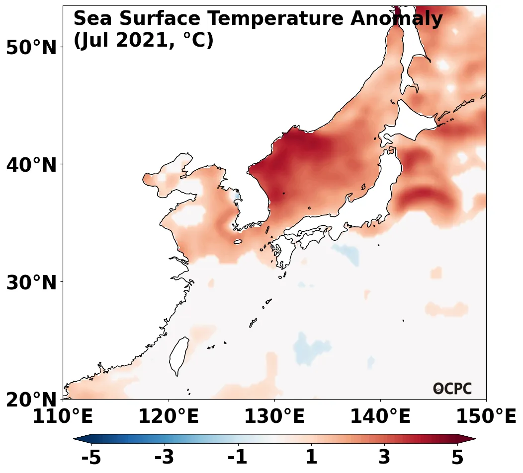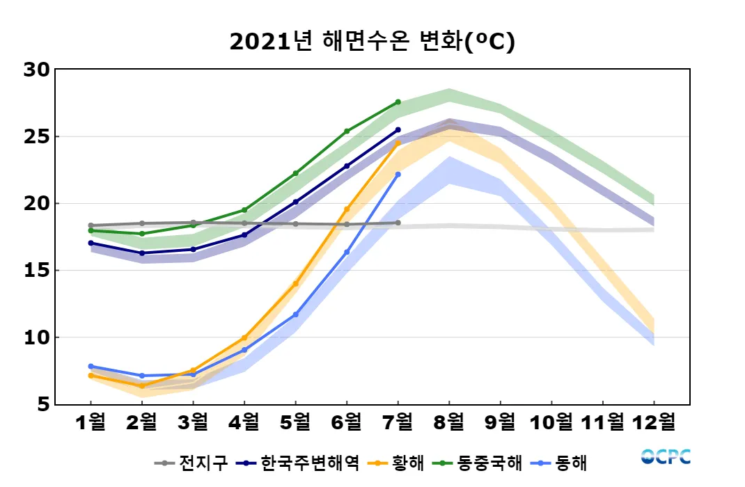 특히 동해는 평년(19.5°C)보다 2.7°C 높아 위성관측 기간(약 40년) 이래 최고치(22.2°C)를 기록했습니다.