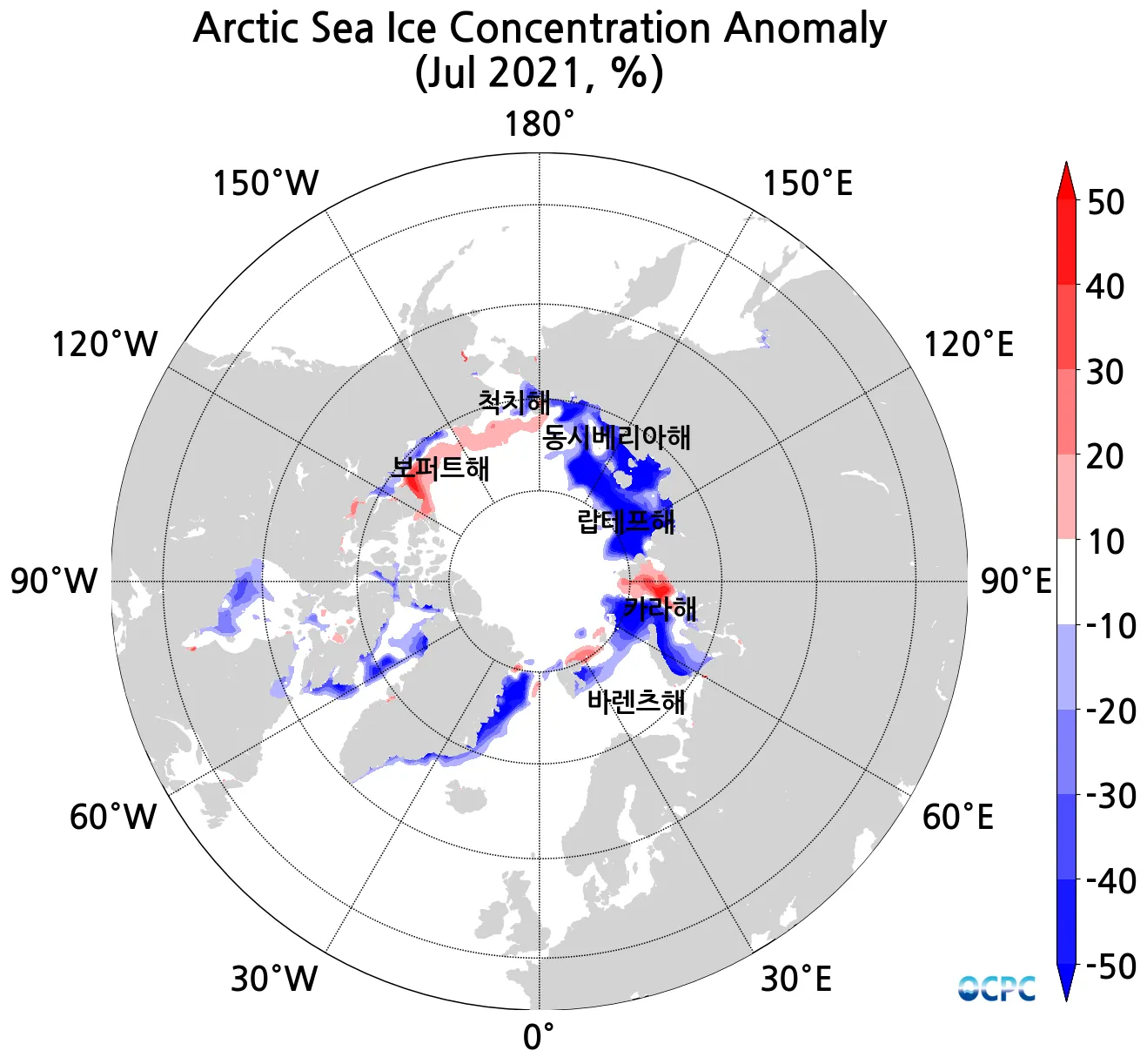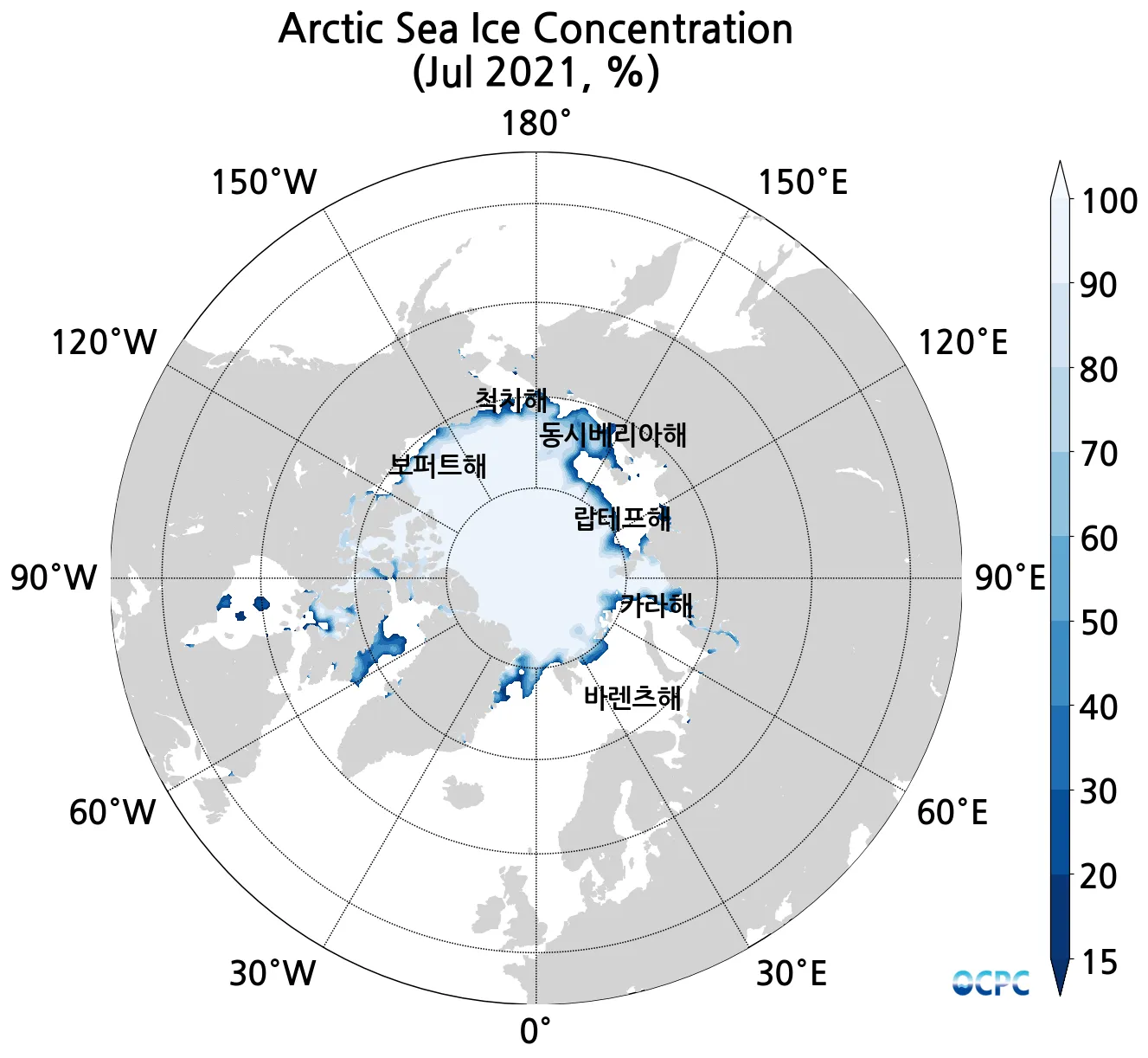 북극 해빙농도는 랍테프해와 바렌츠해, 카라해 서부 해역에서의 감소가 뚜렷한 반면, 보퍼트해, 척치해, 카라해 동부에서는 평년보다 증가했습니다.