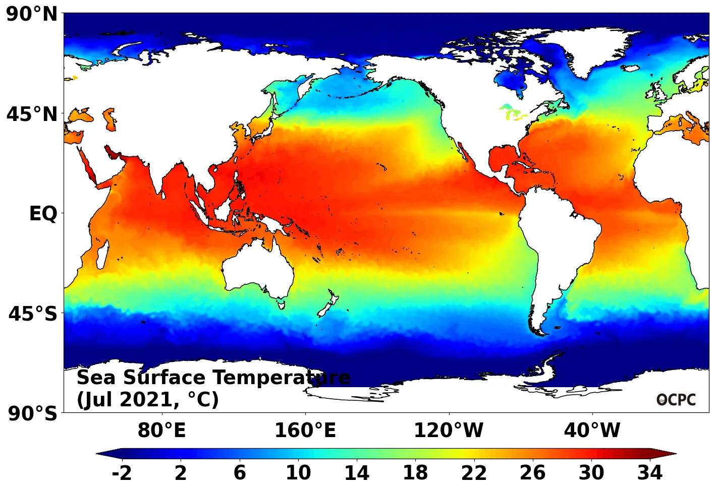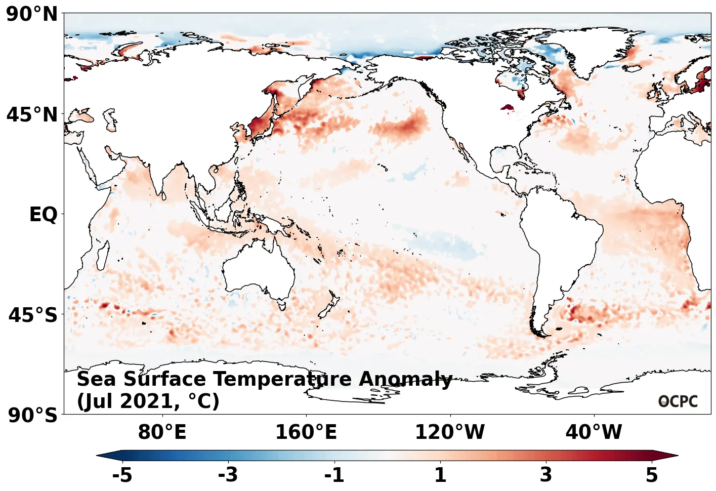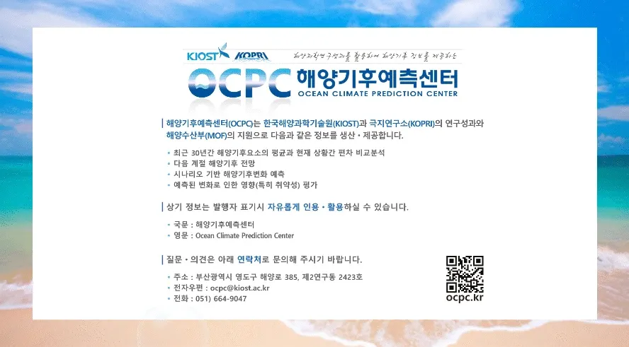 전지구 평균 해면수온은 평년(18.2°C)보다 0.3°C 높았으며, 한국주변해역은 평년(24.7°C)보다 0.9°C 높았습니다.