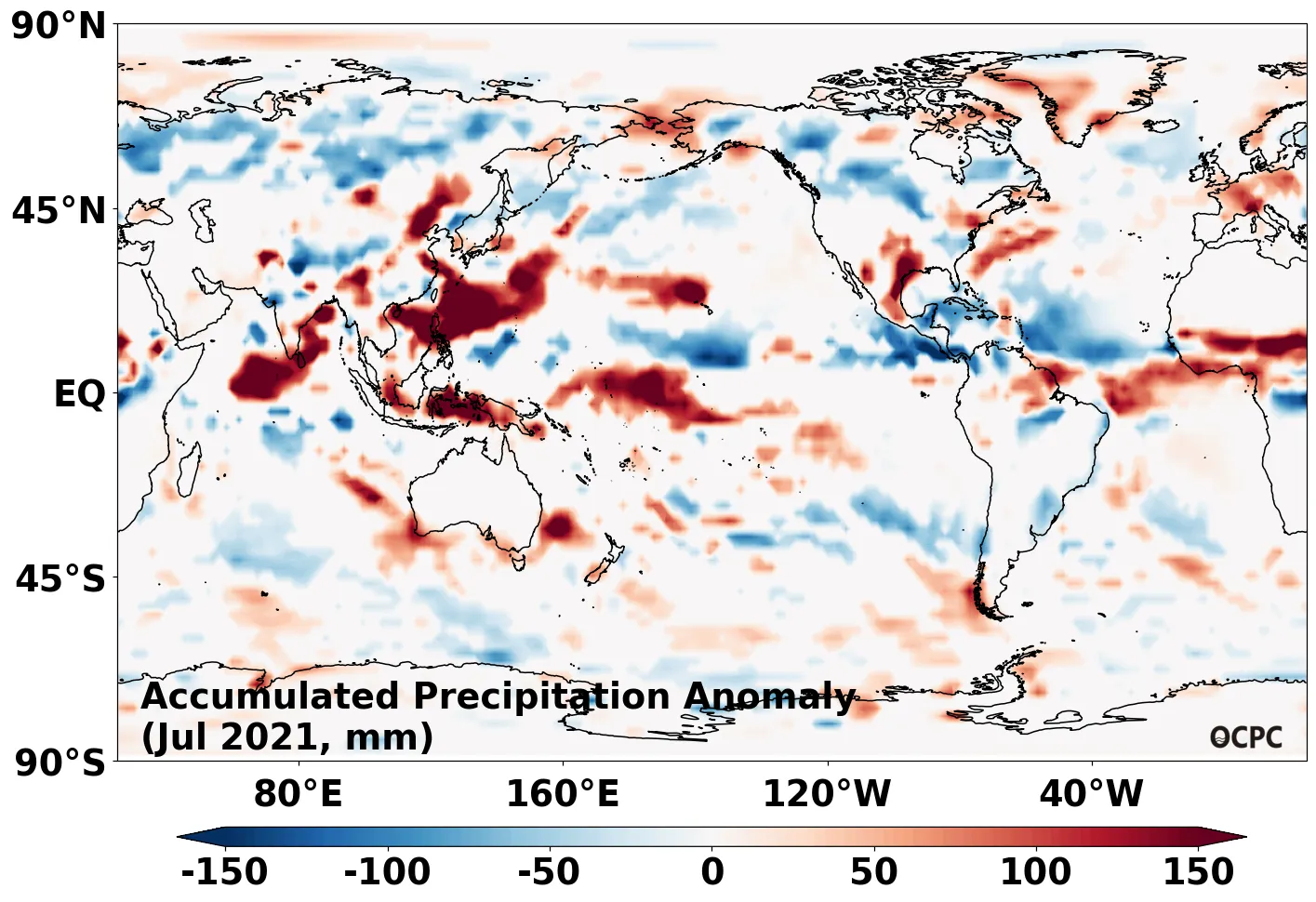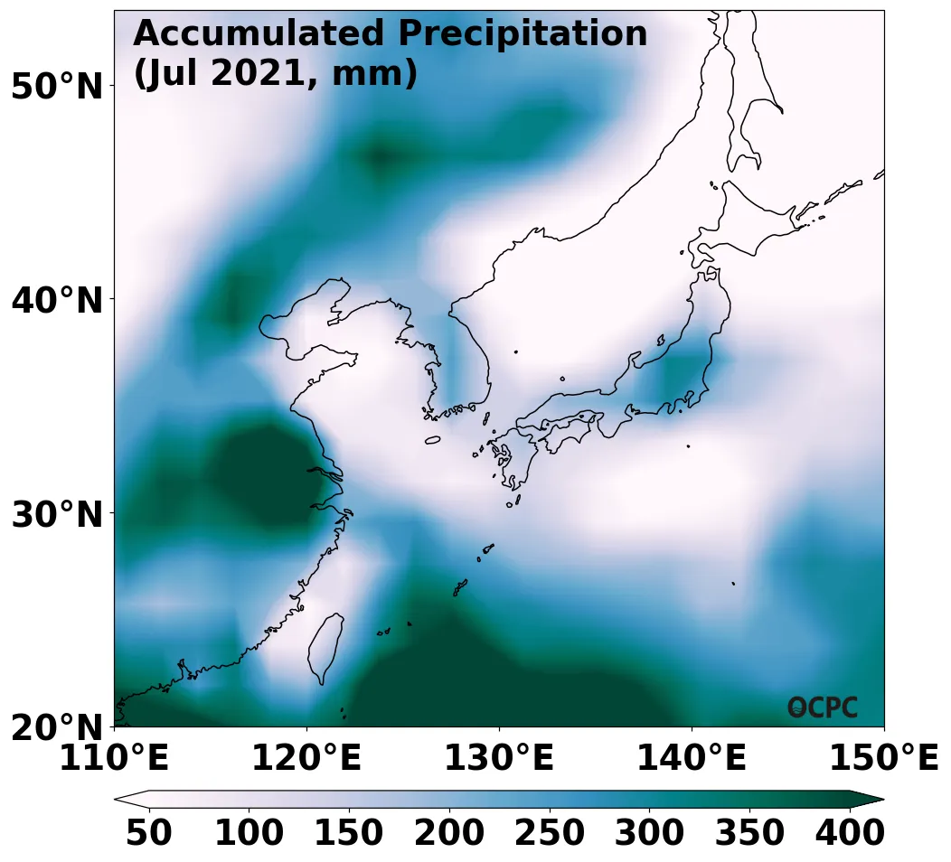 최근 30년 동안 전지구 및 동중국해의 7월 누적 해상강수량은 10년에 1.2mm, 2.3mm씩 감소하는 추세입니다.