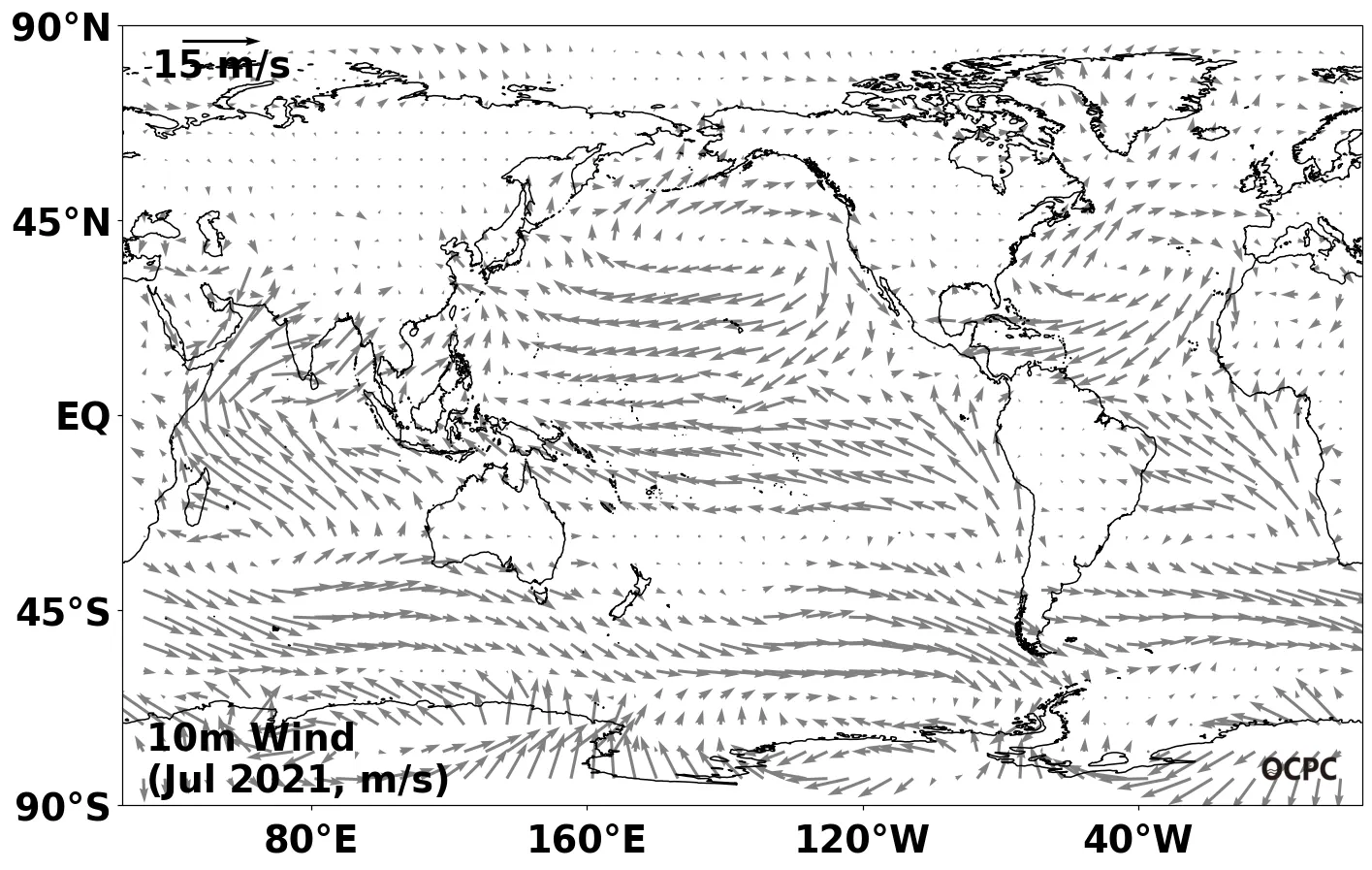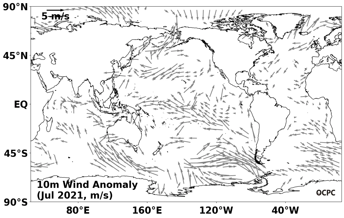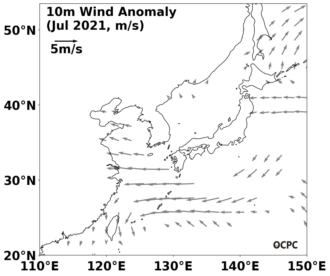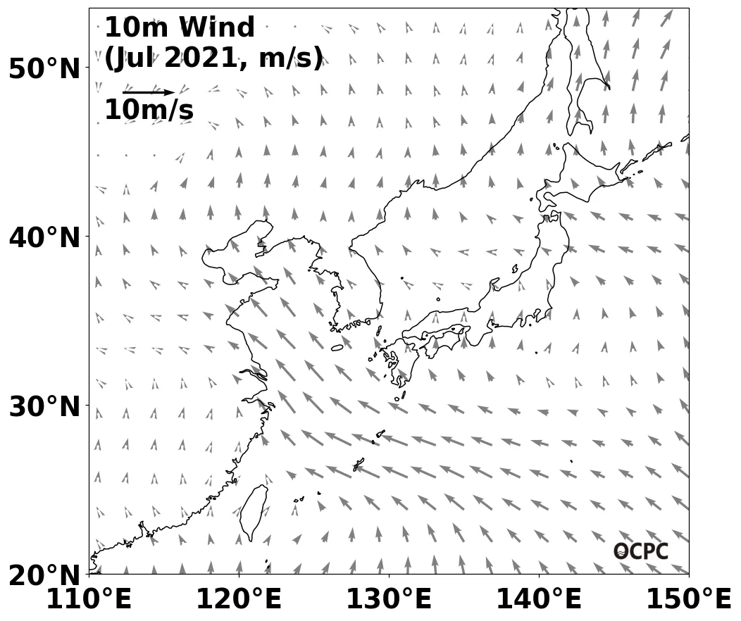 최근 30년 동안 전지구 7월 해상풍속은 10년에 0.01m/s씩 증가하는 추세이며, 한국주변해역은 10년에 0.01m/s씩 감소하는 추세입니다.