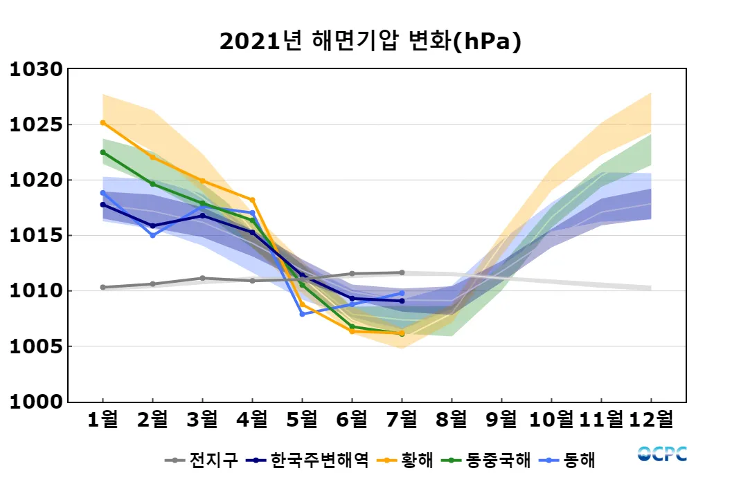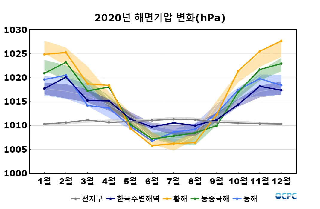황해와 동해의 해면기압은 10년에 0.2~0.3hPa씩 증가하는 추세이며, 동중국해는 10년에 0.1hPa씩 감소하는 추세입니다.