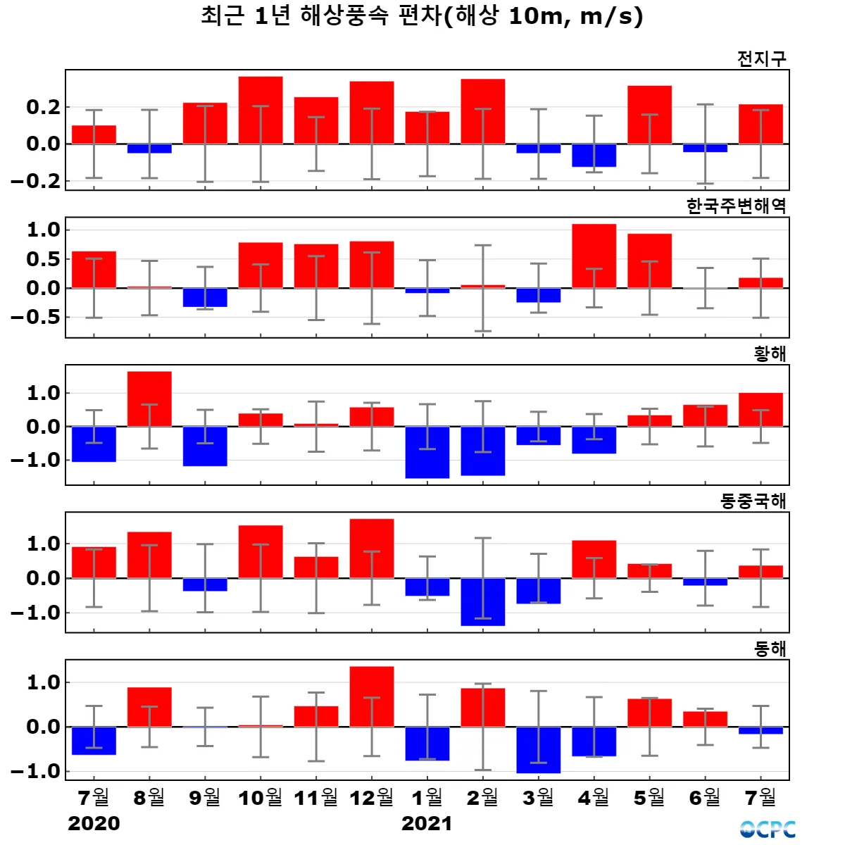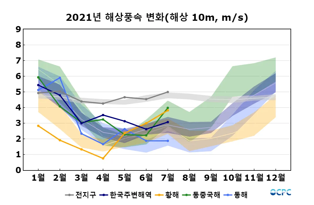 전지구, 황해의 해상풍속은 평년보다 각각 0.2m/s, 1.0m/s 강했으며, 한국주변해역, 동해, 동중국해는 평년과 비슷했습니다.