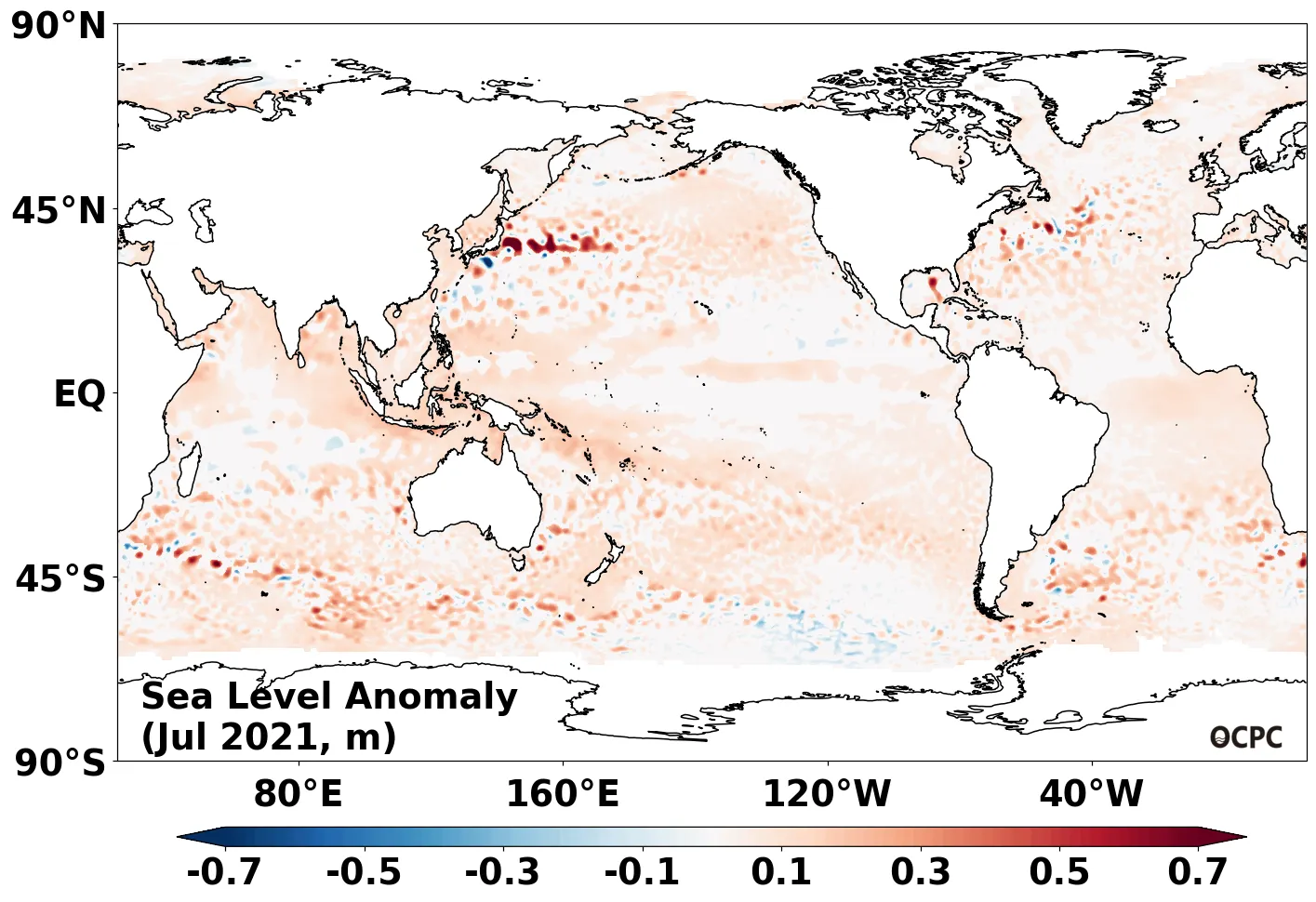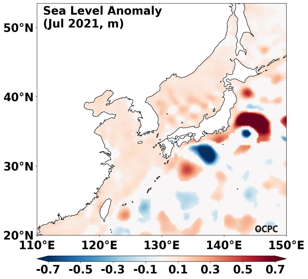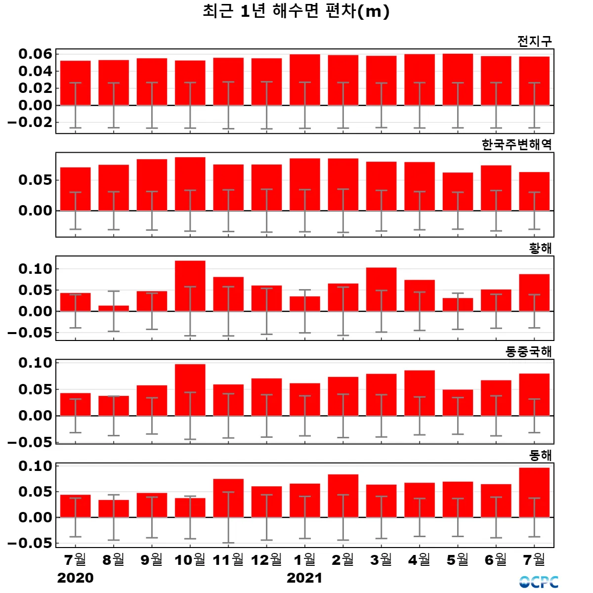 최근 28년 동안 7월의 전지구 해수면은 10년에 3.3cm씩, 한국주변해역은 3.2cm씩 상승하는 추세이며, 동해의 상승률이 10년에 3.8cm로 가장 높았습니다.