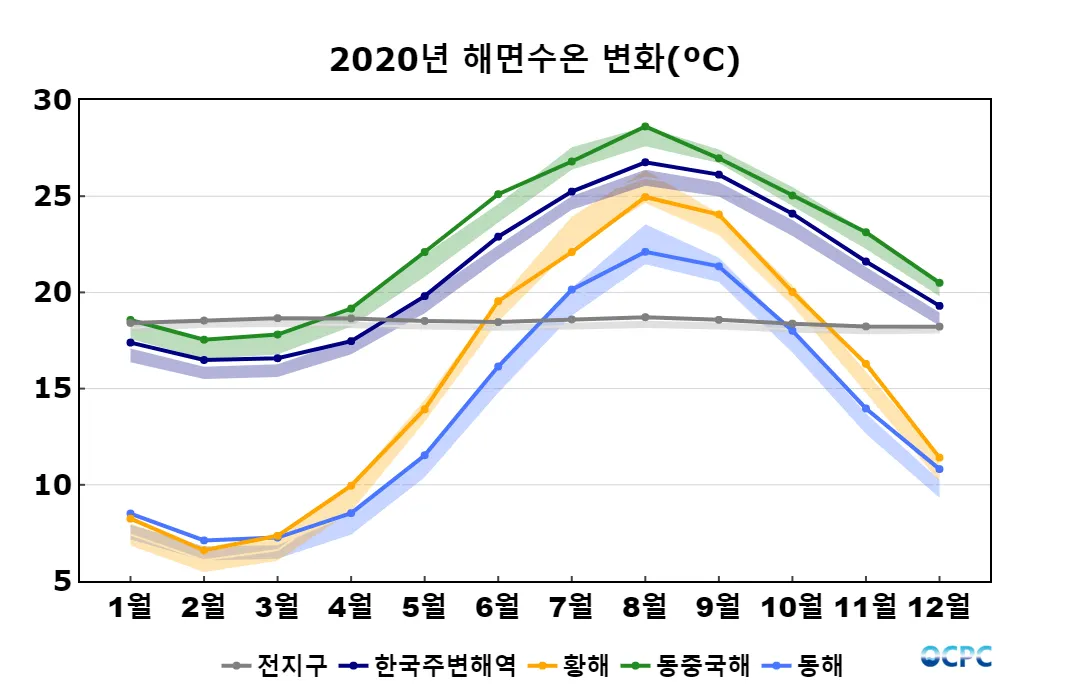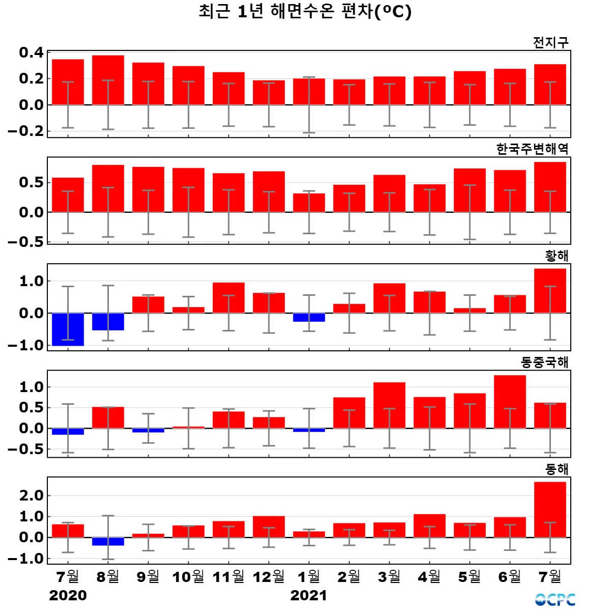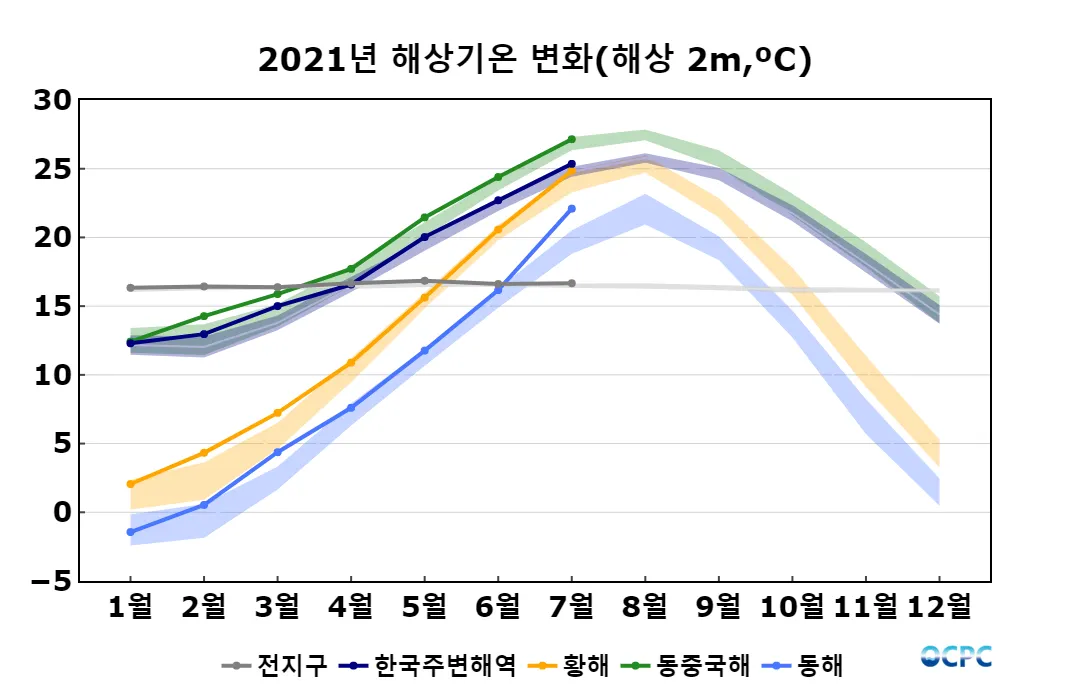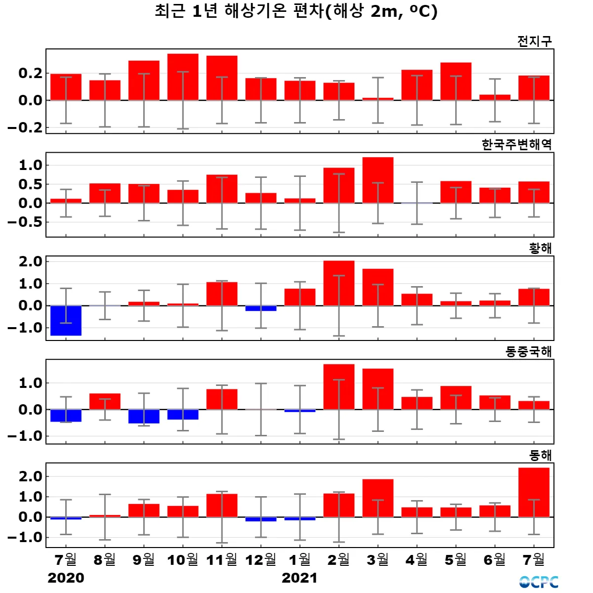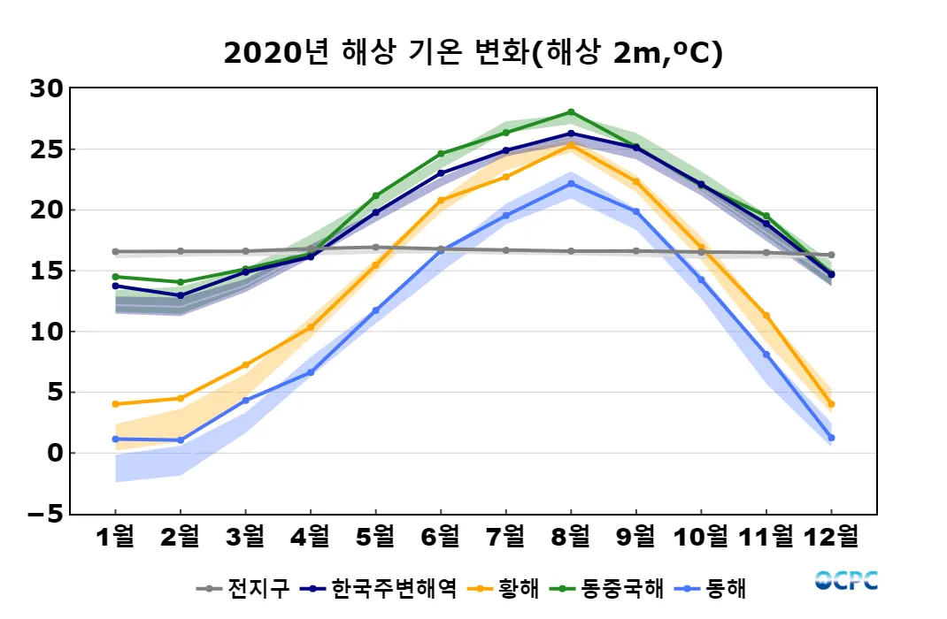 전지구, 한국주변해역, 동해의 해상기온은 평년보다 각각 0.2℃, 0.6℃, 2.4℃ 높았으며, 황해와 동중국해는 평년과 비슷했습니다.