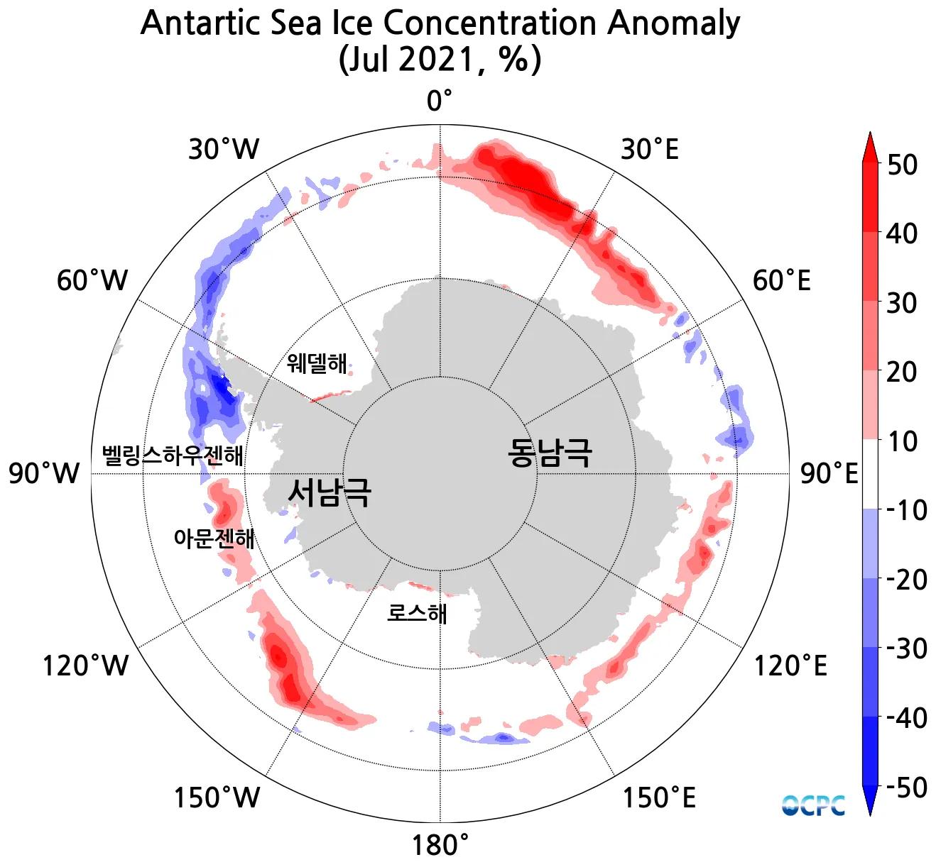 남극 해빙농도는 벨링스하우젠해와 웨델해에서는 감소하였으나, 아문젠해, 로스해, 동대서양-서인도양 섹터(0~60°E)에서 크게 증가했습니다.