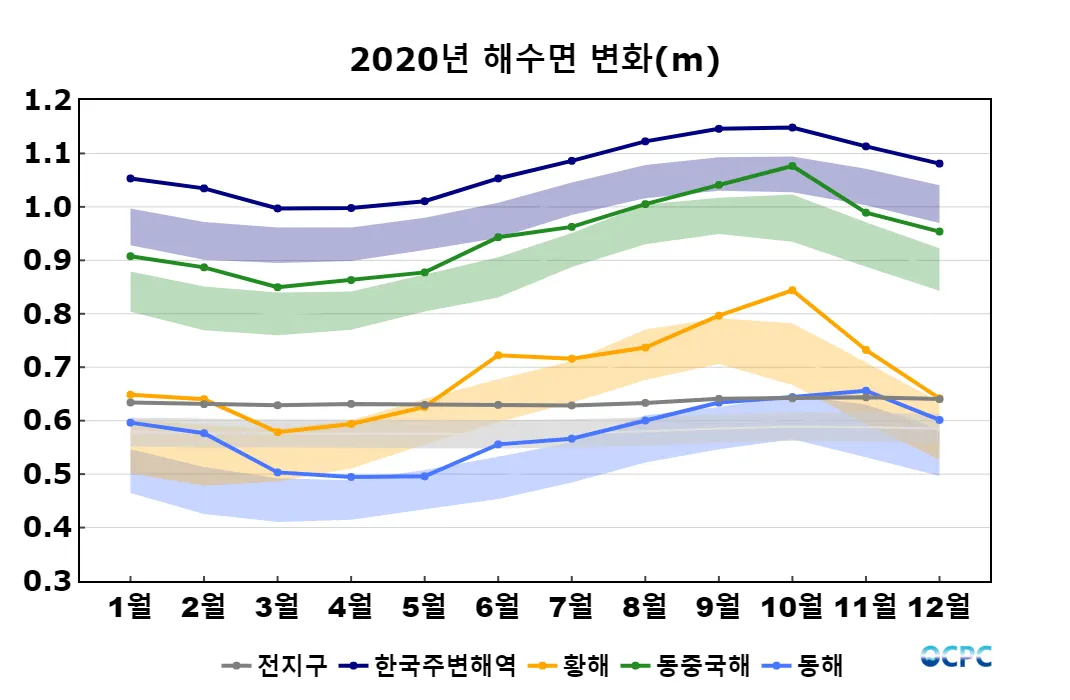 전지구 및 한국주변해역 평균 해수면은 평년보다 높았으며, 특히 동해는 평년보다 9.7cm 높았습니다.