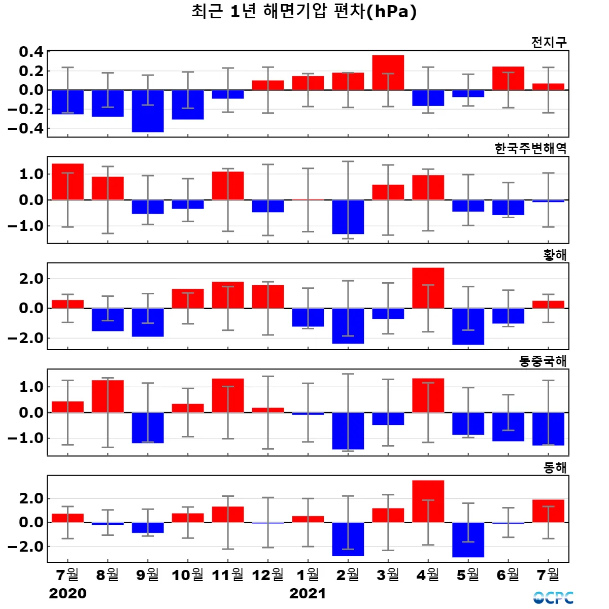 전지구, 한국주변해역, 황해의 해면기압은 평년과 비슷했으나 동해는 1.9hPa 높았으며, 동중국해는 1.3hPa 낮았습니다.
