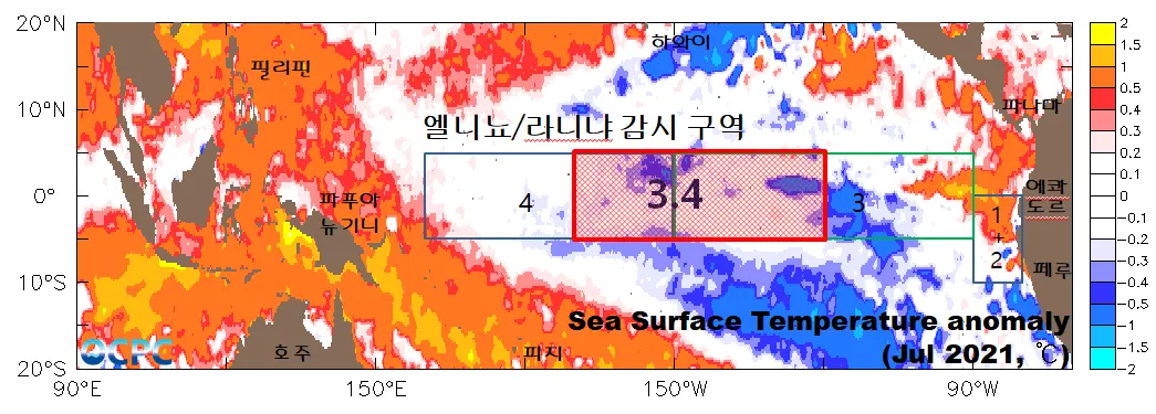 엘니뇨/라니냐 감시구역의 2021년 7월 평균 해면수온 편차 (자료 : OISST)
