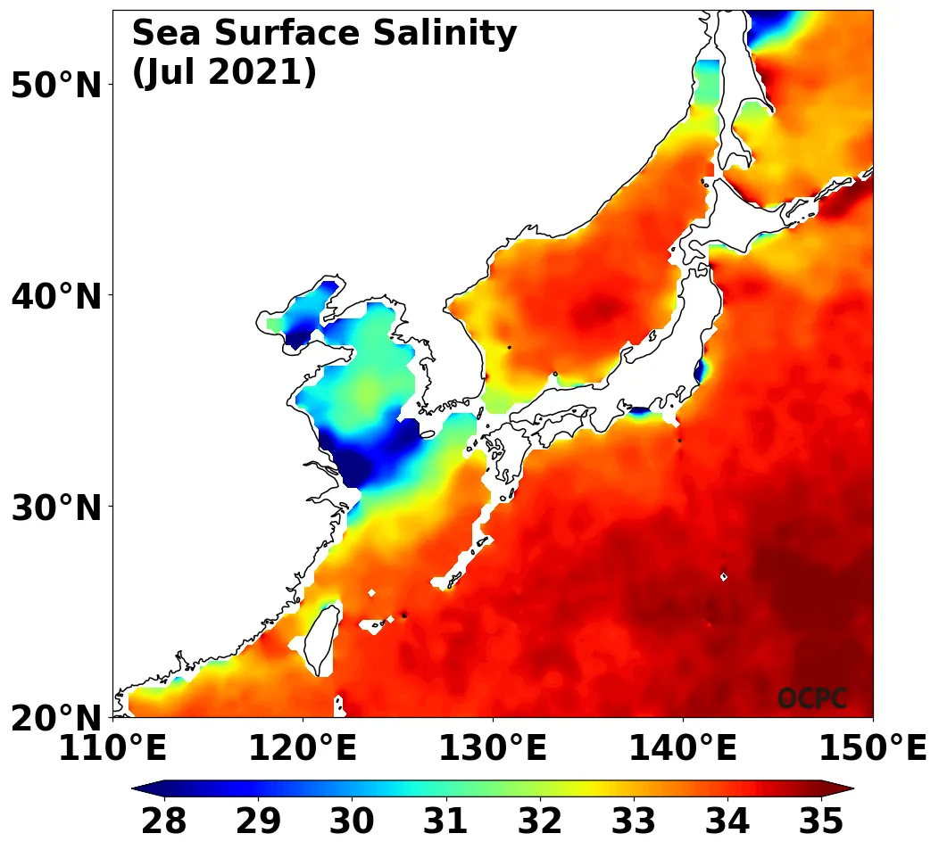 7월 해면염분은 동해 및 쿠로시오해류역에서 높고 황해 및 동중국해에서 낮았습니다.