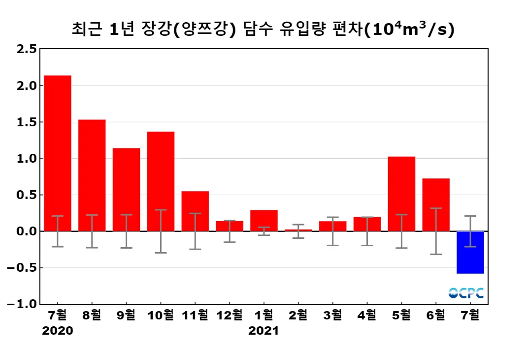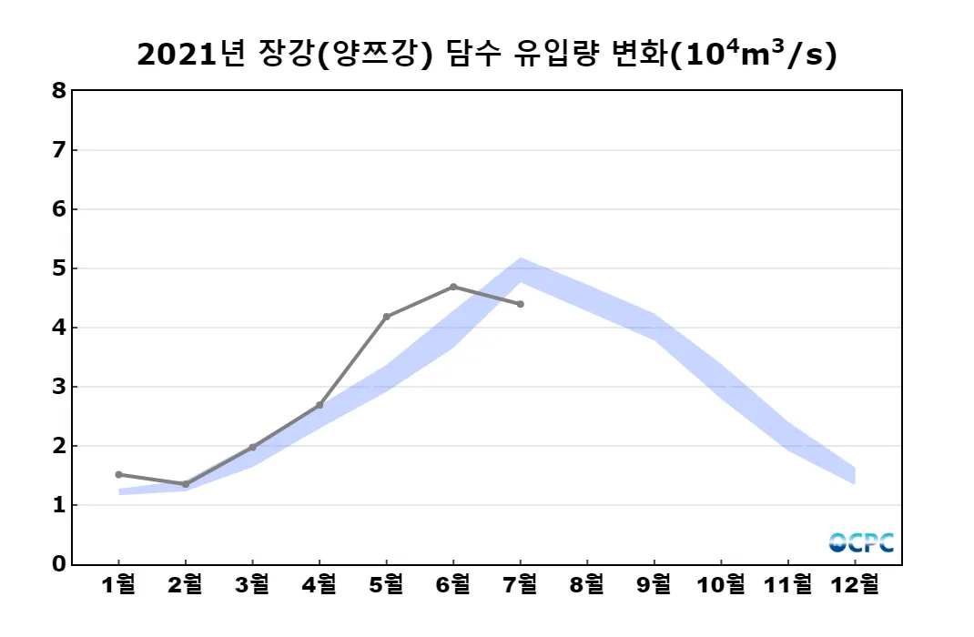 양쯔강(장강)으로부터의 담수 유입량은 평년보다 12% 적은 초당 약 4만4천톤이었으며, 이는 지난 6월보다 6.7% 감소한 것이고 작년 7월보다는 61.9% 감소한 양입니다.