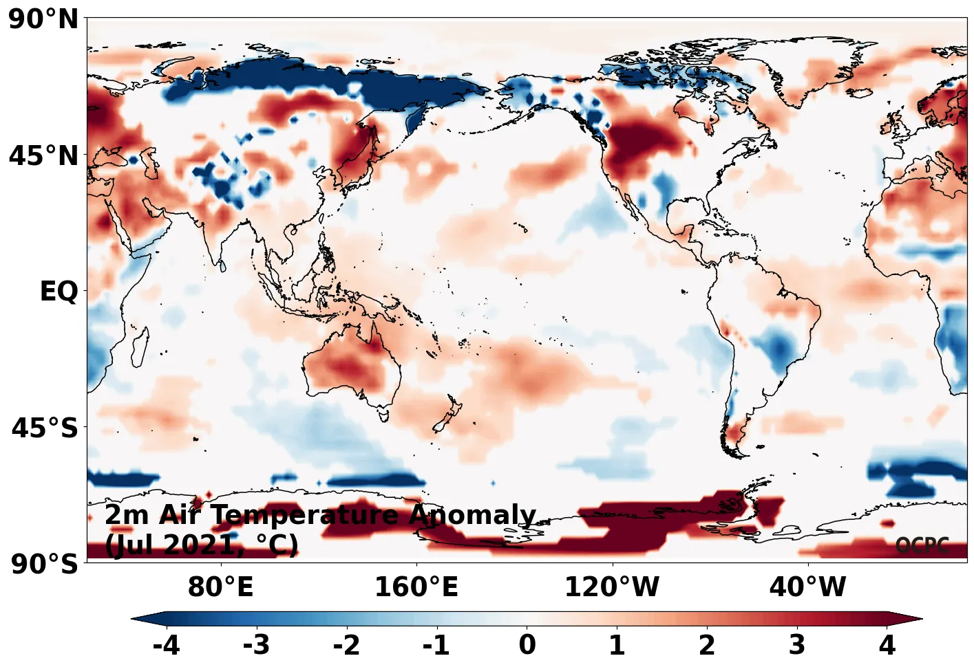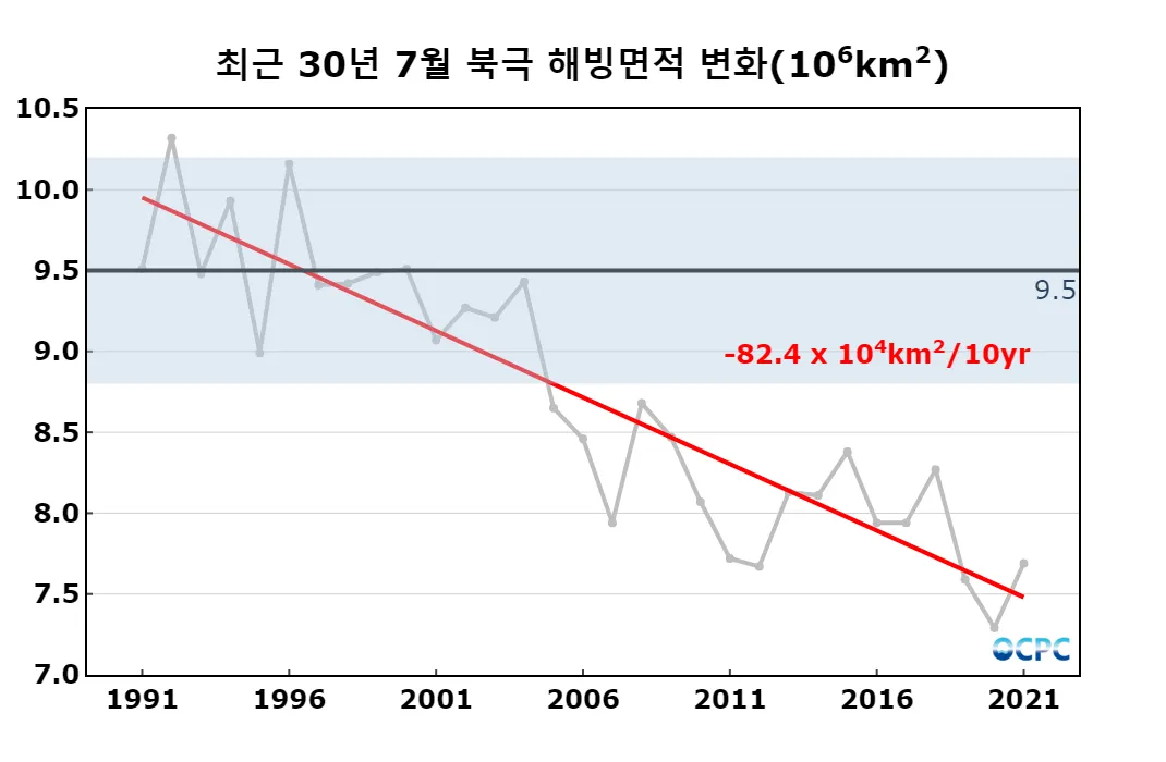 최근 30년 동안 7월 북극 해빙면적의 경향은 10년에 82만km² 정도의 감소 추세에 있습니다.