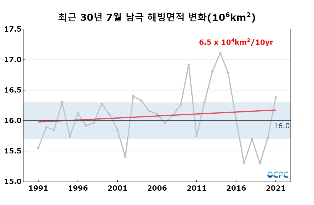 최근 30년 동안 7월 남극 해빙면적 변화 경향은 10년에 6.5만km²로 증가 추세입니다.