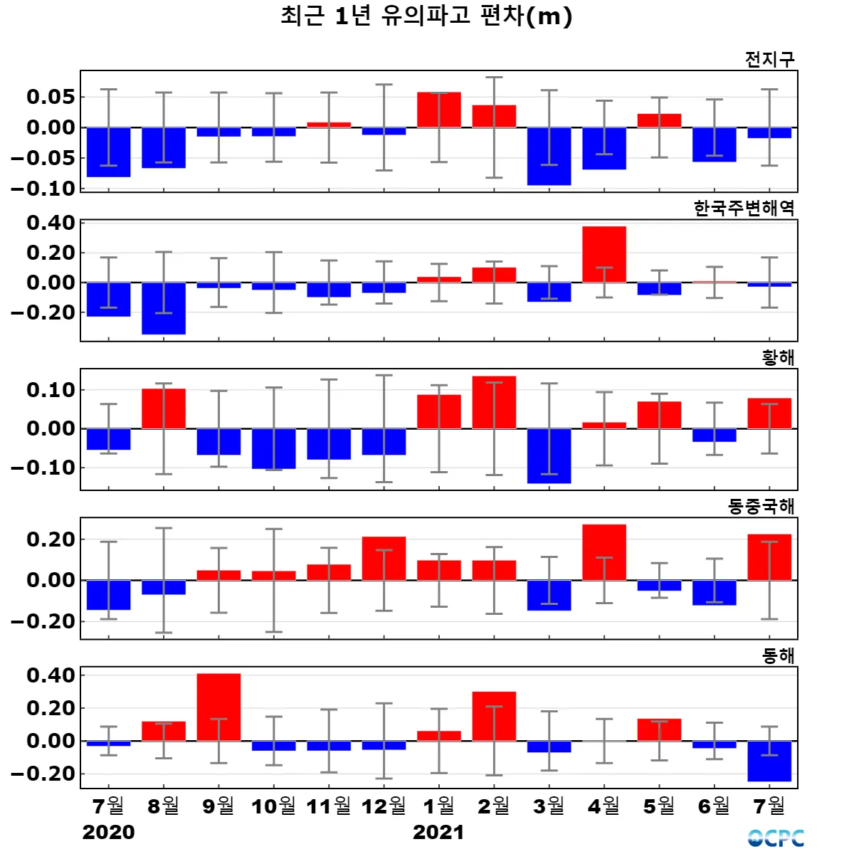 전지구 및 한국주변해역 유의파고는 평년과 비슷했으나, 황해와 동중국해는 각각 7.9cm, 22.5cm 높았고, 동해는 24.8cm 낮았습니다.