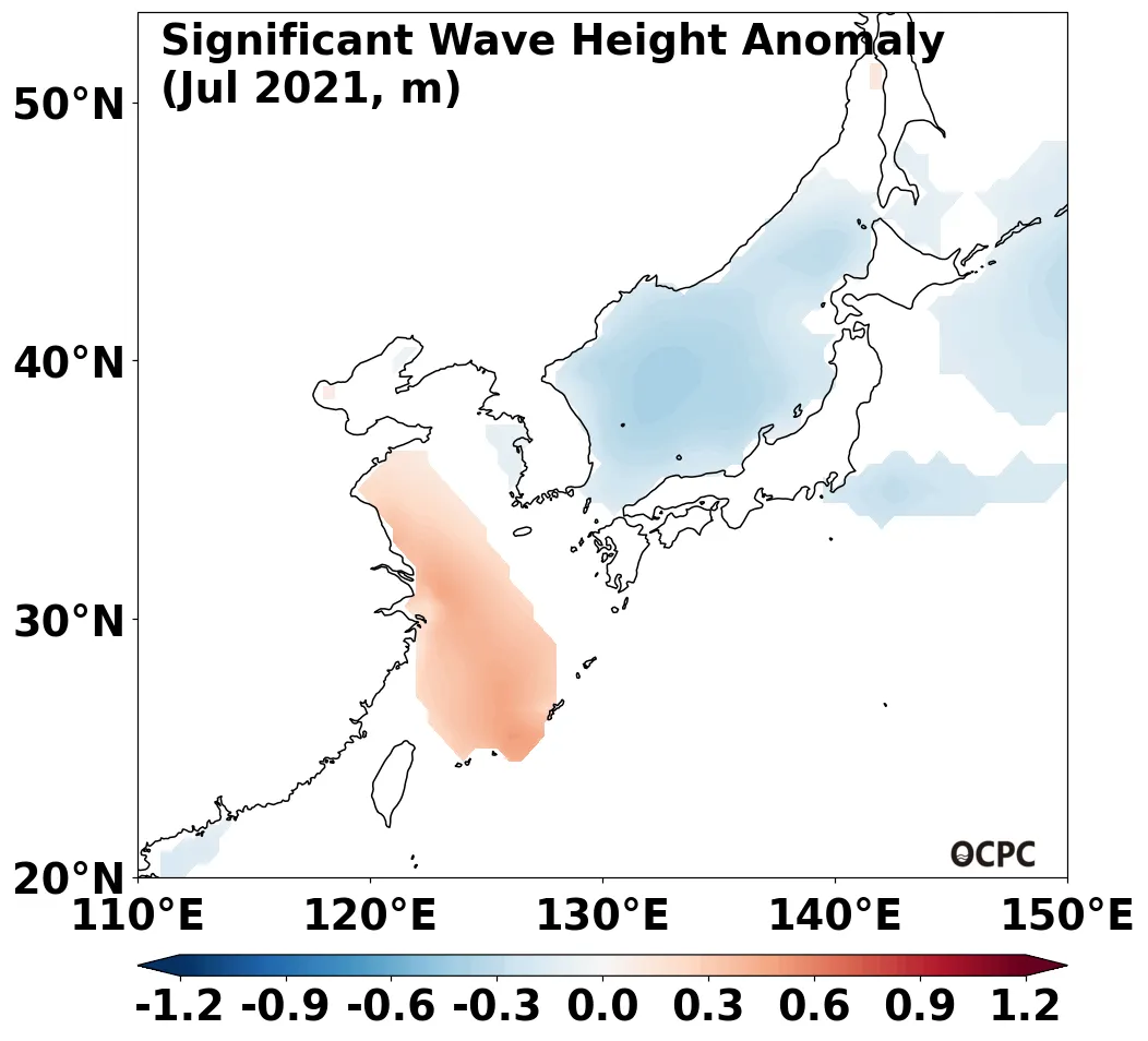 황해와 동중국해의 평균 유의파고는 평년(0.7m, 1.3m)보다 각각 7.9cm, 22.5cm 높았고, 동해는 평년(0.8m)보다 24.8cm 낮았습니다.