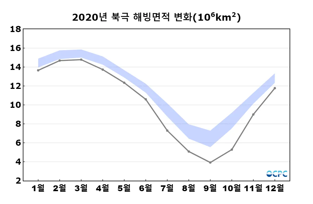 이는 최소 면적을 기록한 2020년보다는 40만km² 늘어난 값이며, 위성관측 기간 중 4번째로 작은 값입니다.