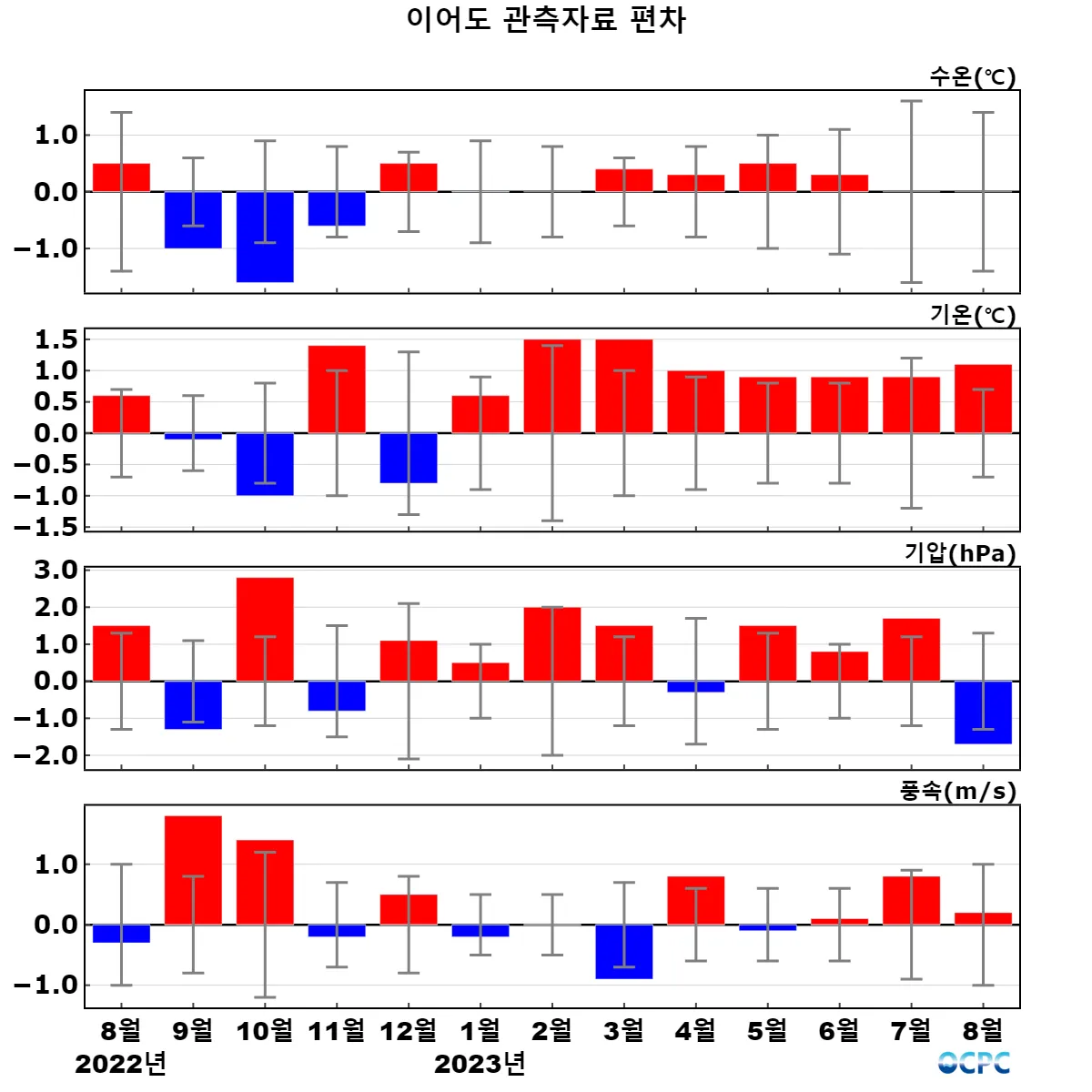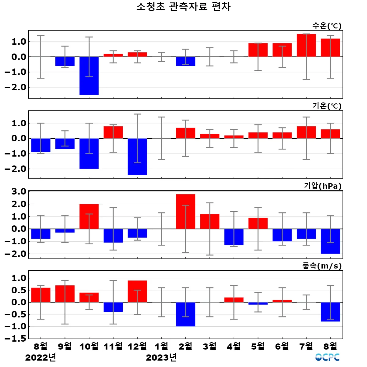 관측기간(2004~2023년) 월평균 대비 최근 13개월 편차 (세로 막대는 관측기간 중 월별 표준편차 구간) (수온은 수심 3m, 기온은 해상 42.1m, 기압은 해상 35.9m 값이며, 풍속은 해상 42.9m 관측값을 해상 10m 값으로 환산하였음)