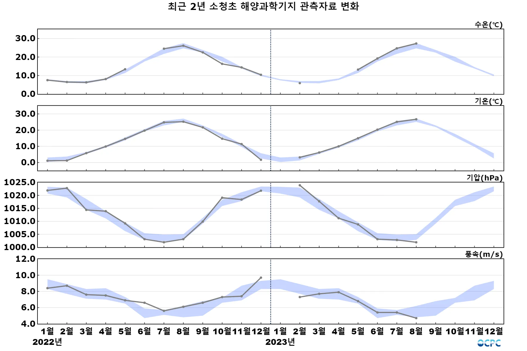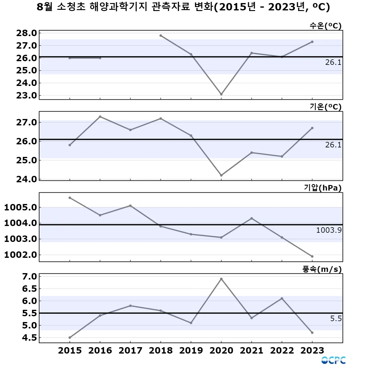 소청초 기지의 8월 평균기압(1001.9hPa)은 2015-2023년 중 가장 낮았습니다.