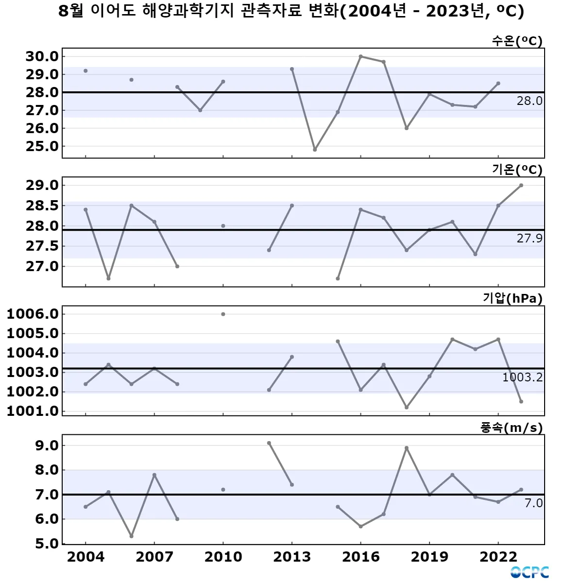 이어도 기지의 8월 평균기온(29.0℃)은 2004-2023년 중 가장 높았습니다.