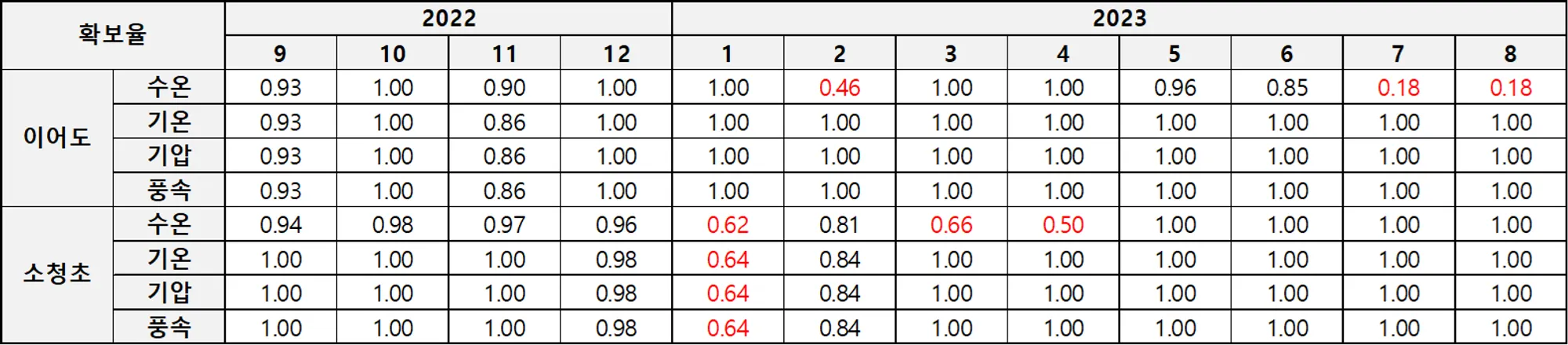 해양과학기지 관측요소별 관측자료 월별 확보율(2022-2023). 최대가 1.0이며 붉은색은 월 확보율 0.8(수온은 0.7) 미만인 자료로 분석에서 제외
