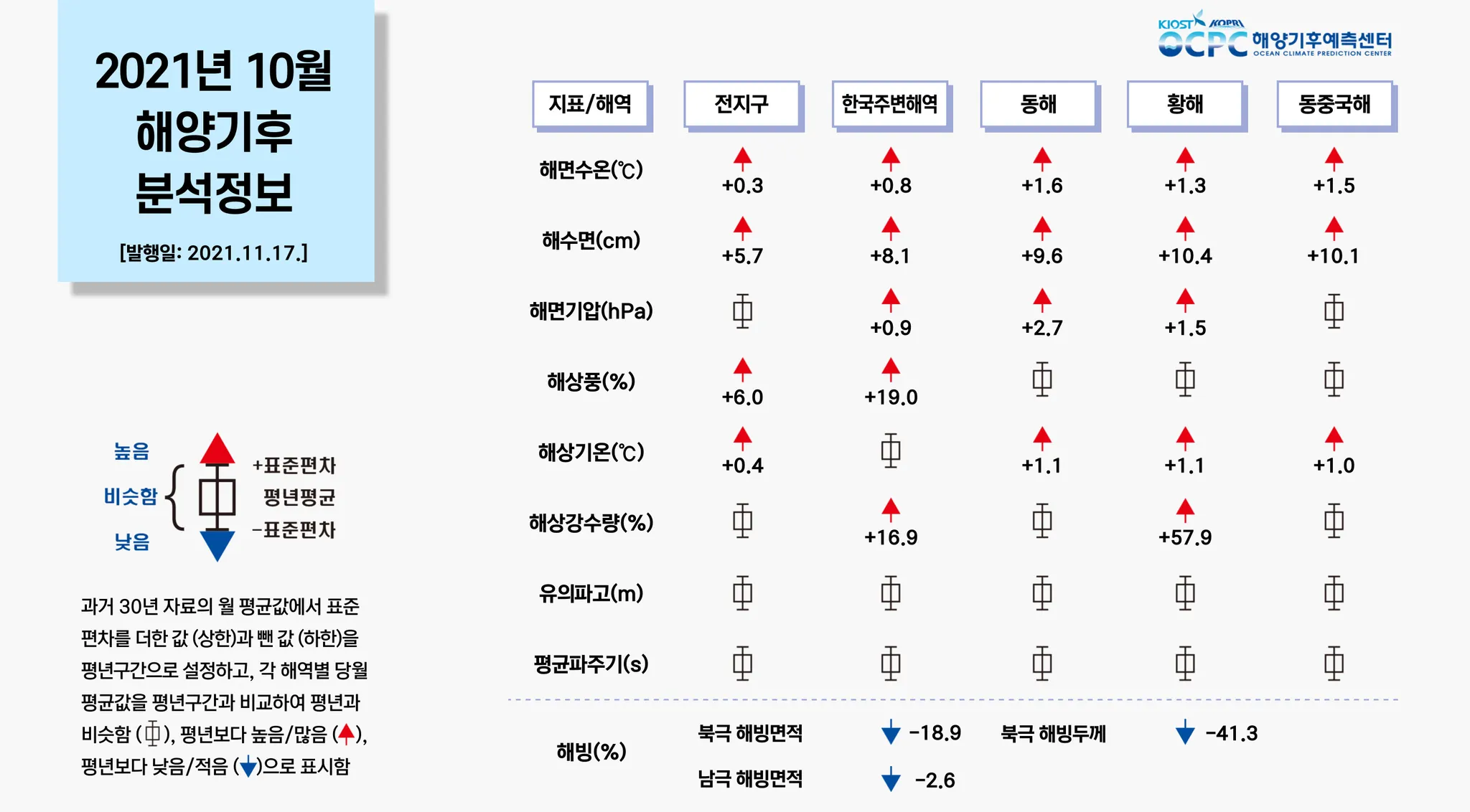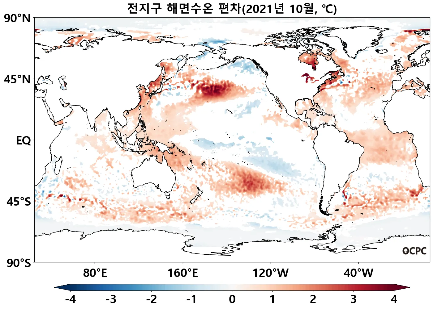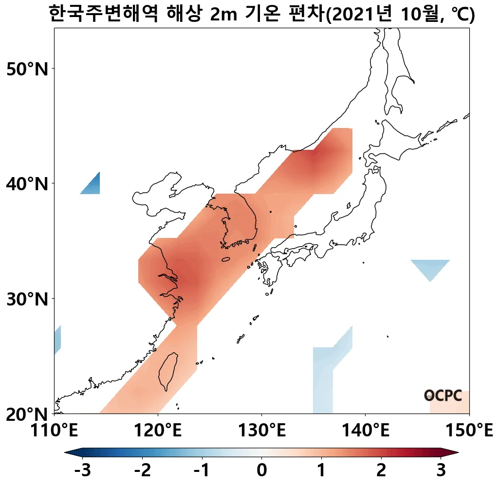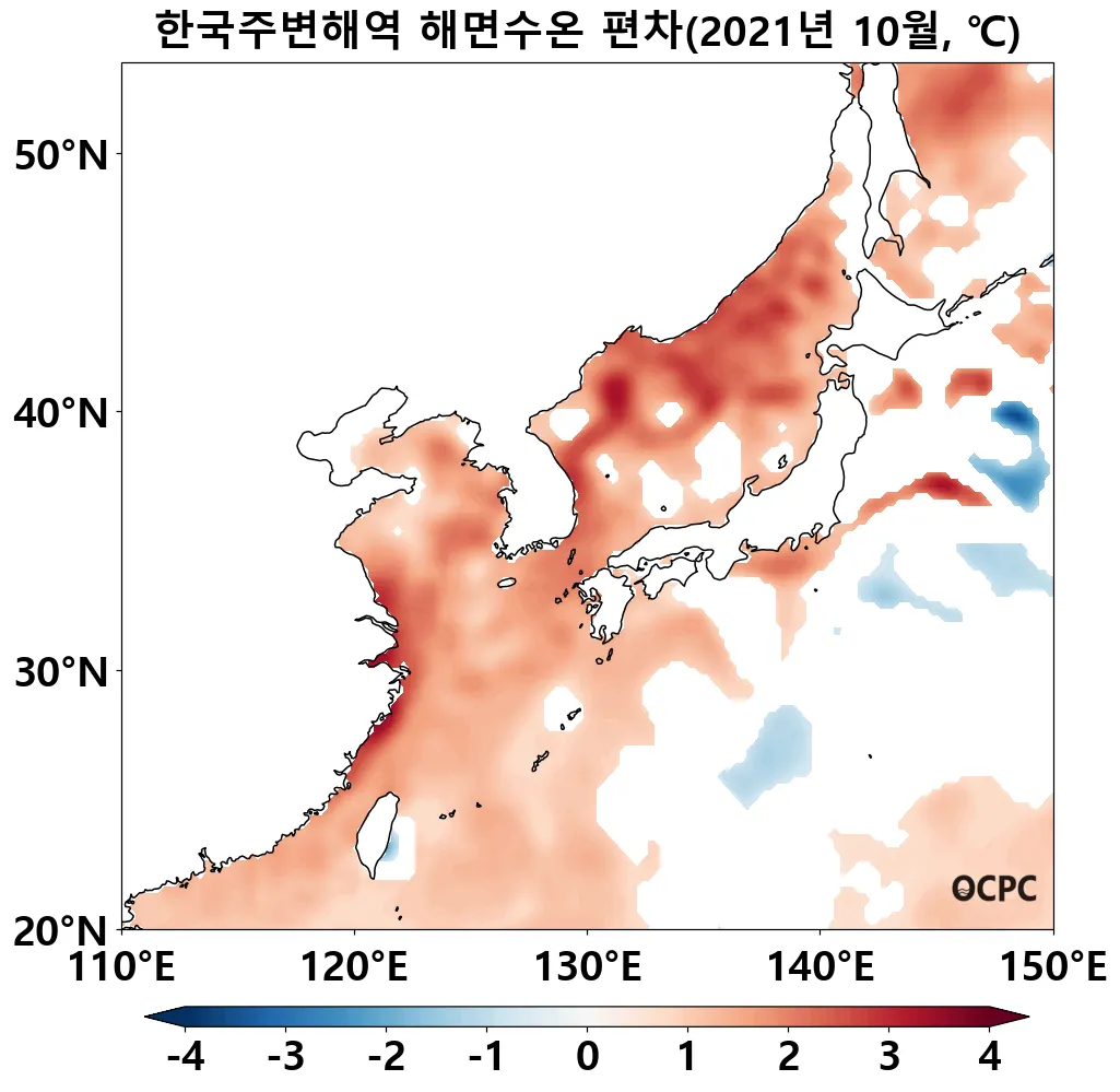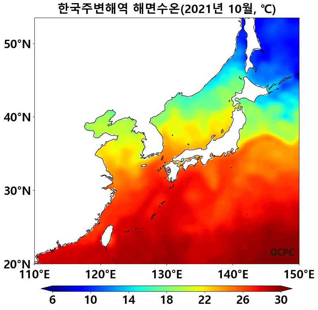 전지구 및 한국주변해역 평균 해면수온은 평년보다 높았으며, 동해와 동중국해 10월 평균 해면수온은 지난 30년 중 최고치를 기록했습니다.