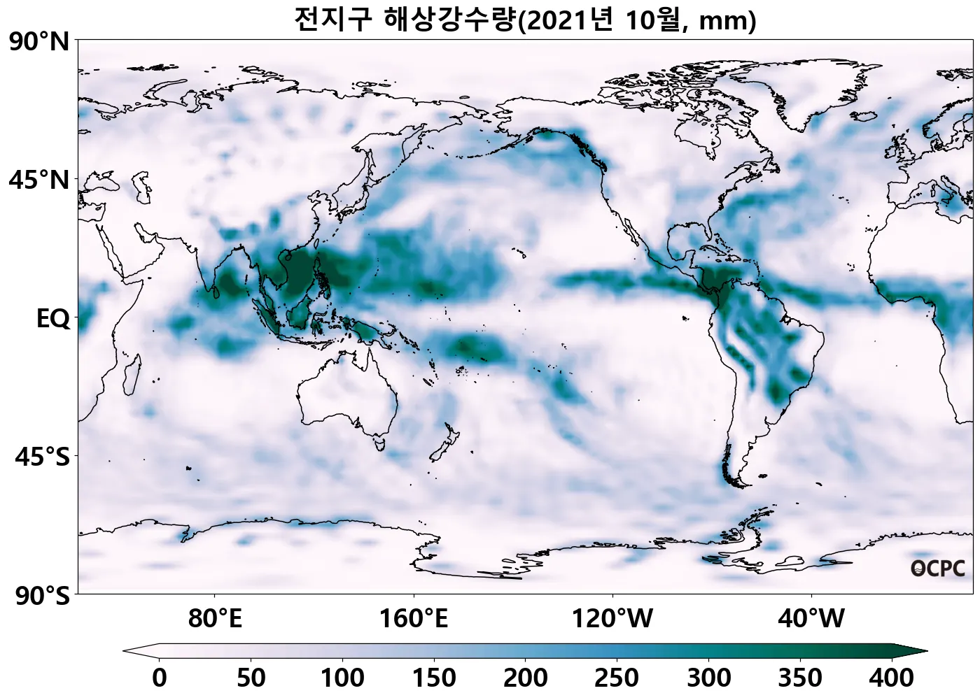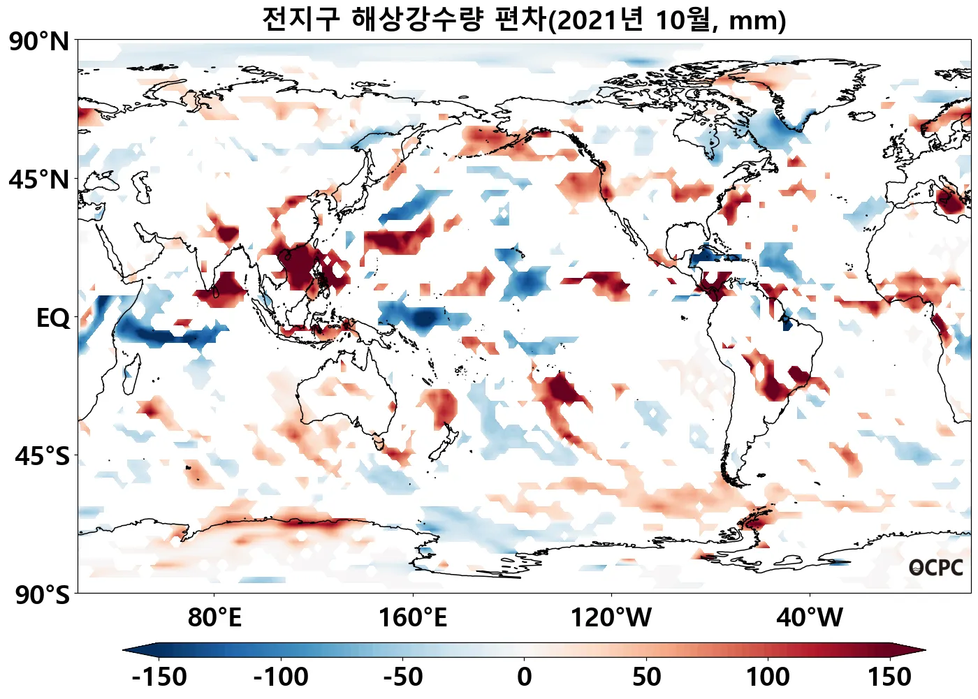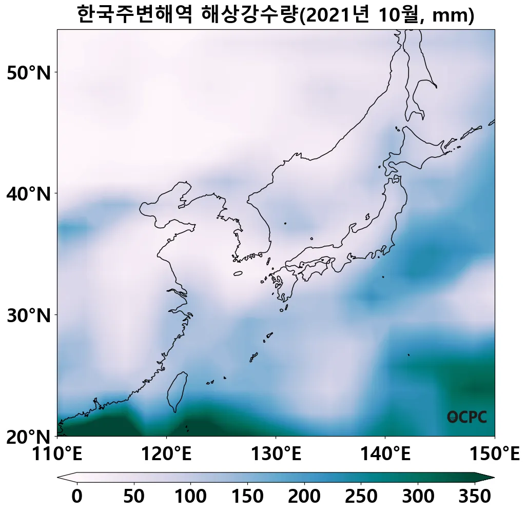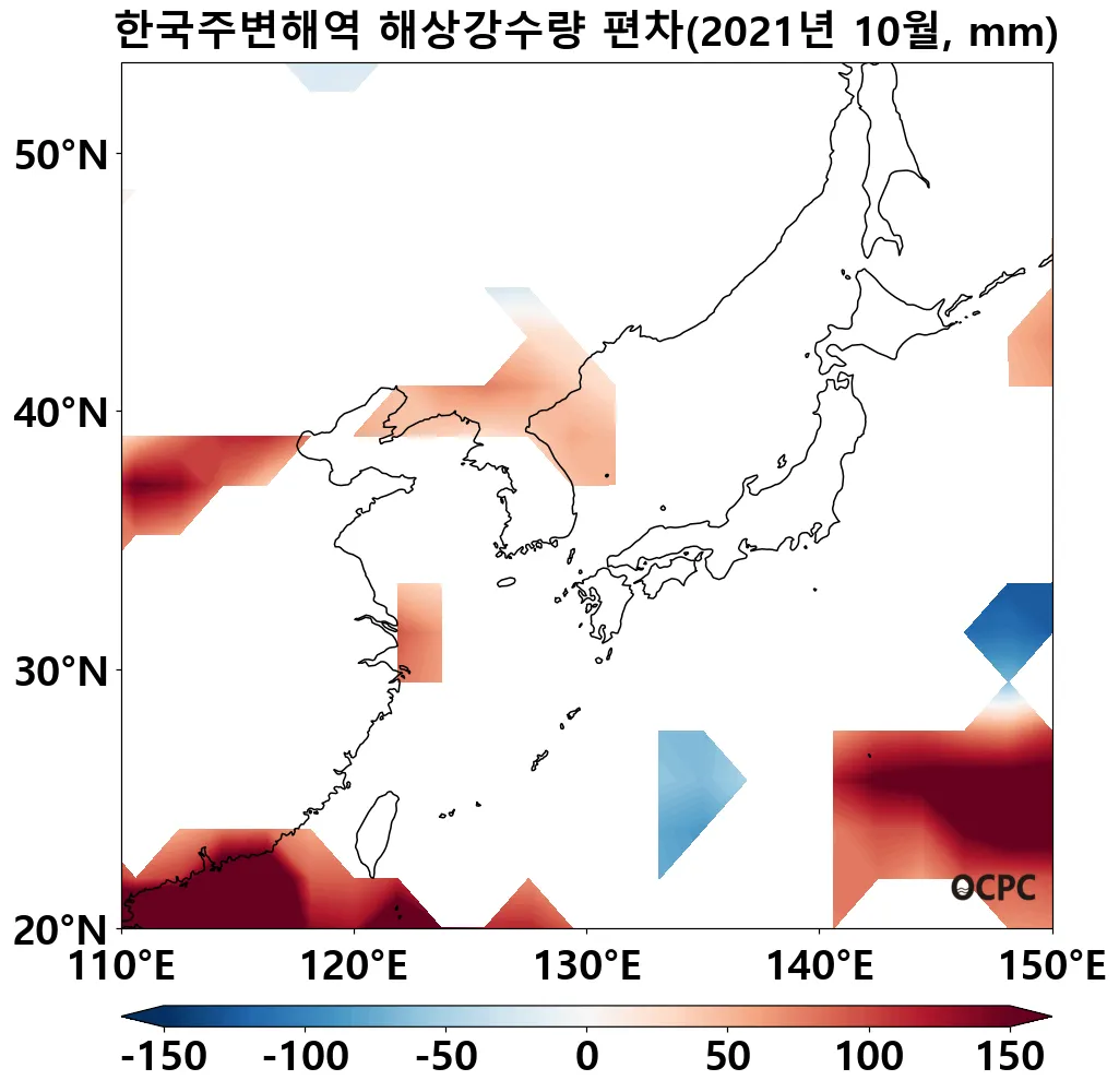 전지구 10월 해상강수량은 평년(89.5mm)과 비슷했으며, 한국주변해역은 평년(129.5mm)보다 21.8mm(16.9%) 많았습니다.
