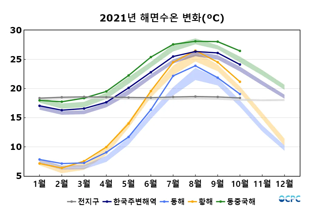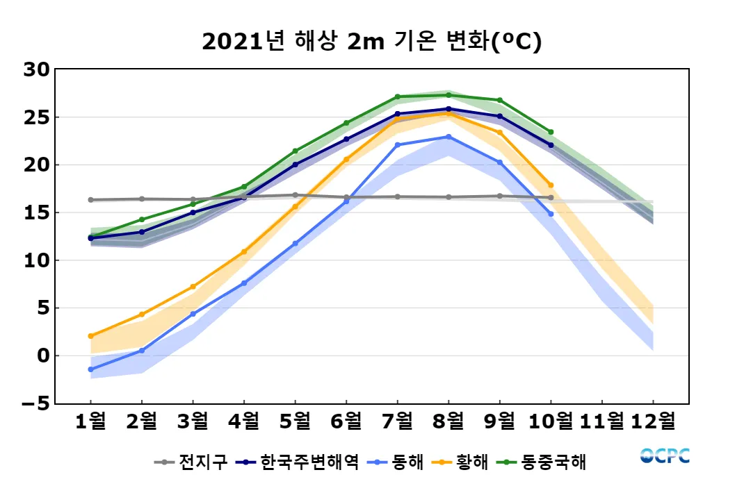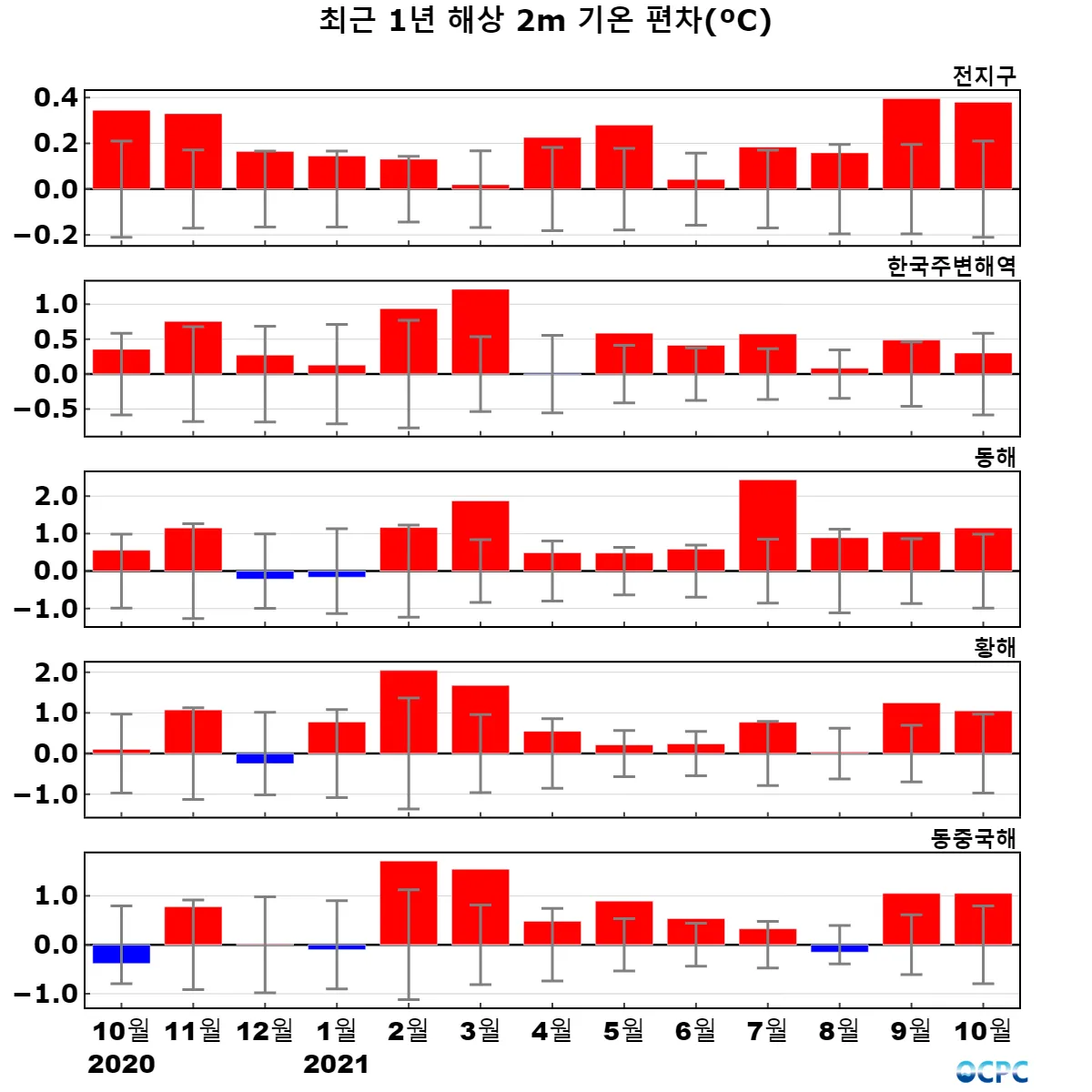 전지구, 동해, 황해, 동중국해의 해상기온은 평년보다 높았으며, 한국주변해역은 평년과 비슷했습니다.