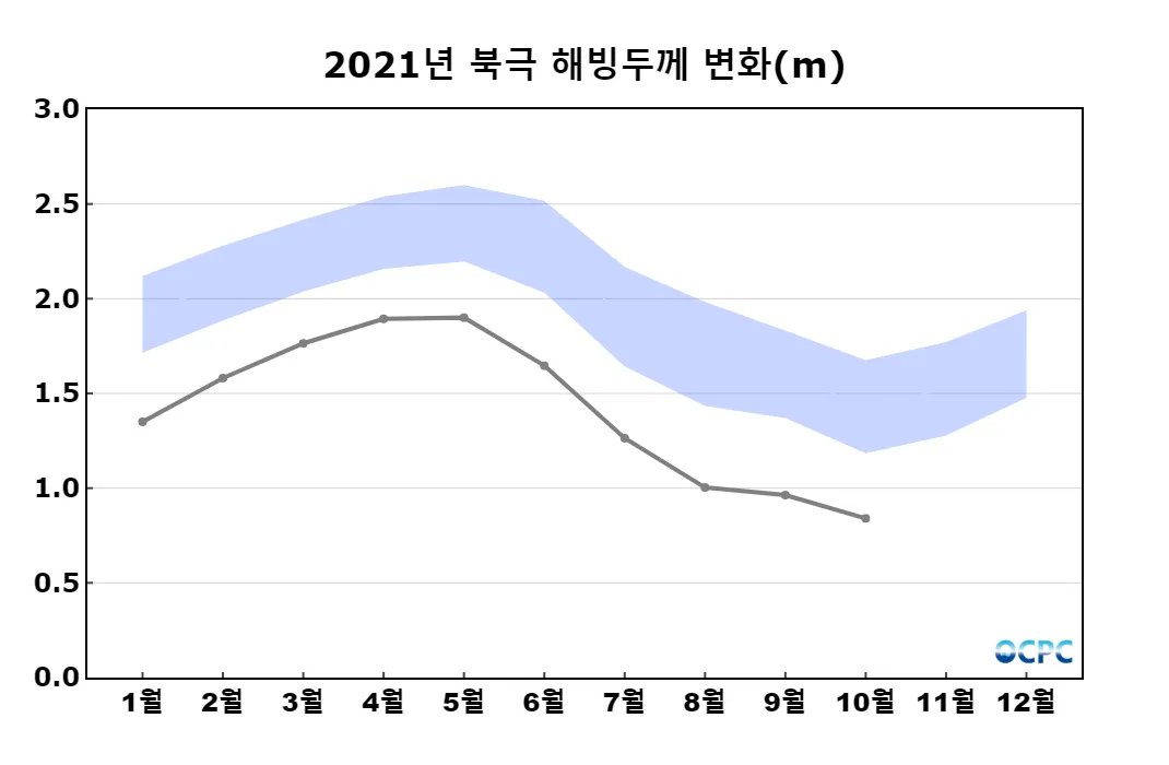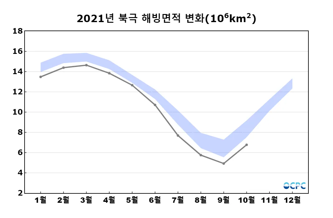 이는 최소 면적을 기록한 2020년보다는 144만km² 늘어난 값이며, 위성관측 기간(1979~2021년) 중 8번째로 작은 값입니다.