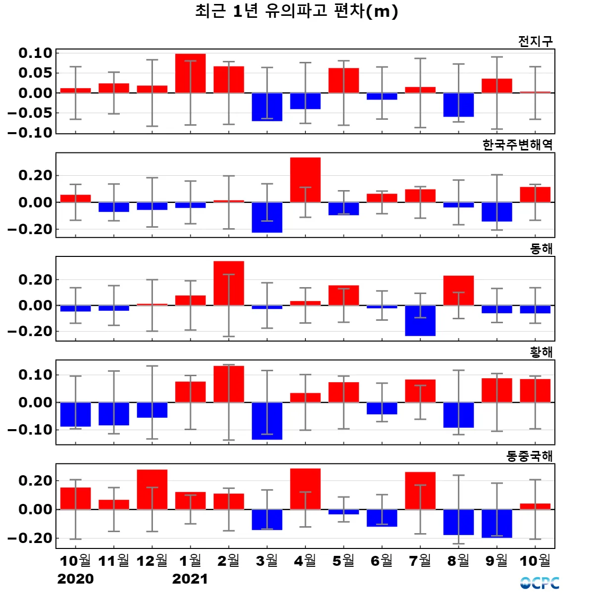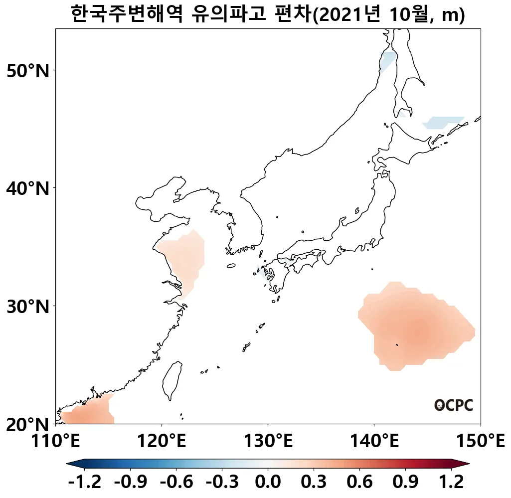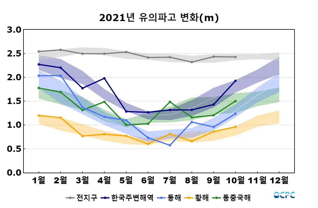 전지구, 한국주변해역, 동해, 황해, 동중국해의 유의파고는 평년과 비슷했습니다.