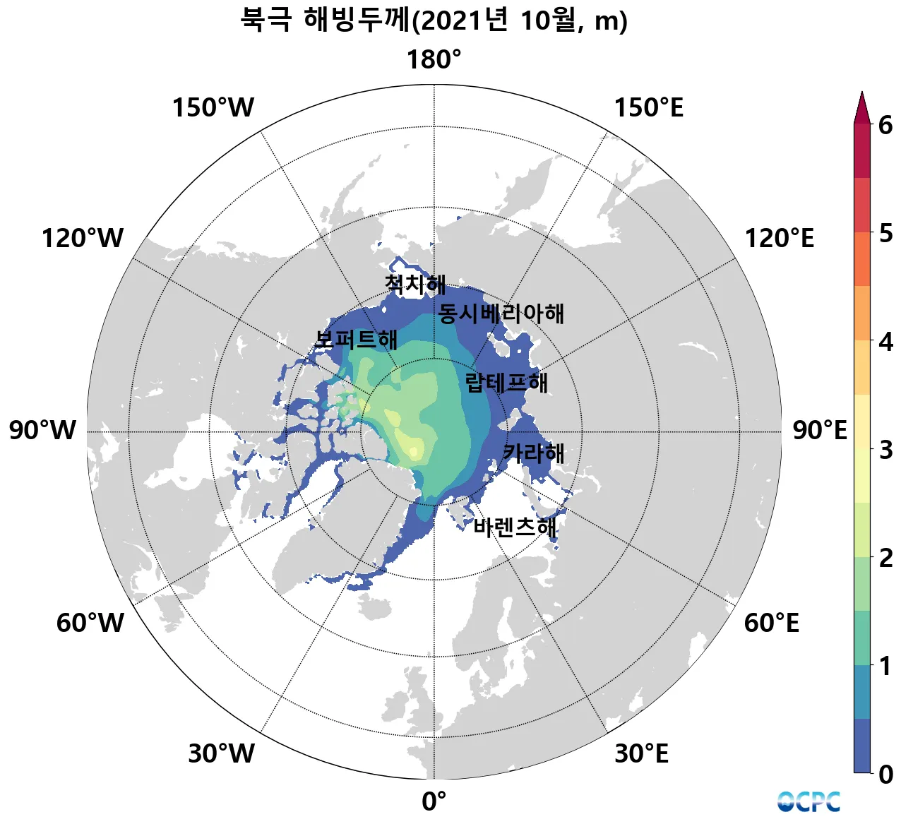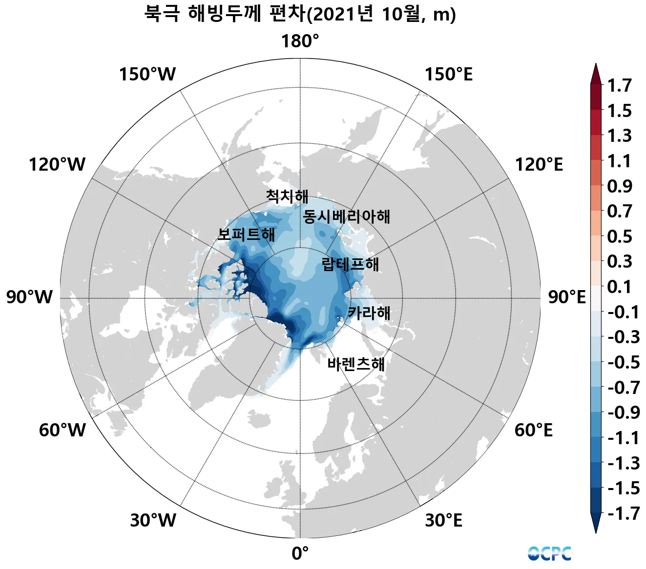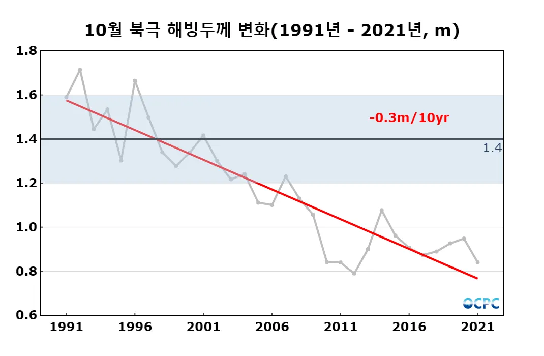 북극 해빙두께는 평년(1.4m)보다 0.6m(41.3%) 얇았으며, 최근 30년 동안 10년에 0.3m씩 얇아지는 추세입니다.
