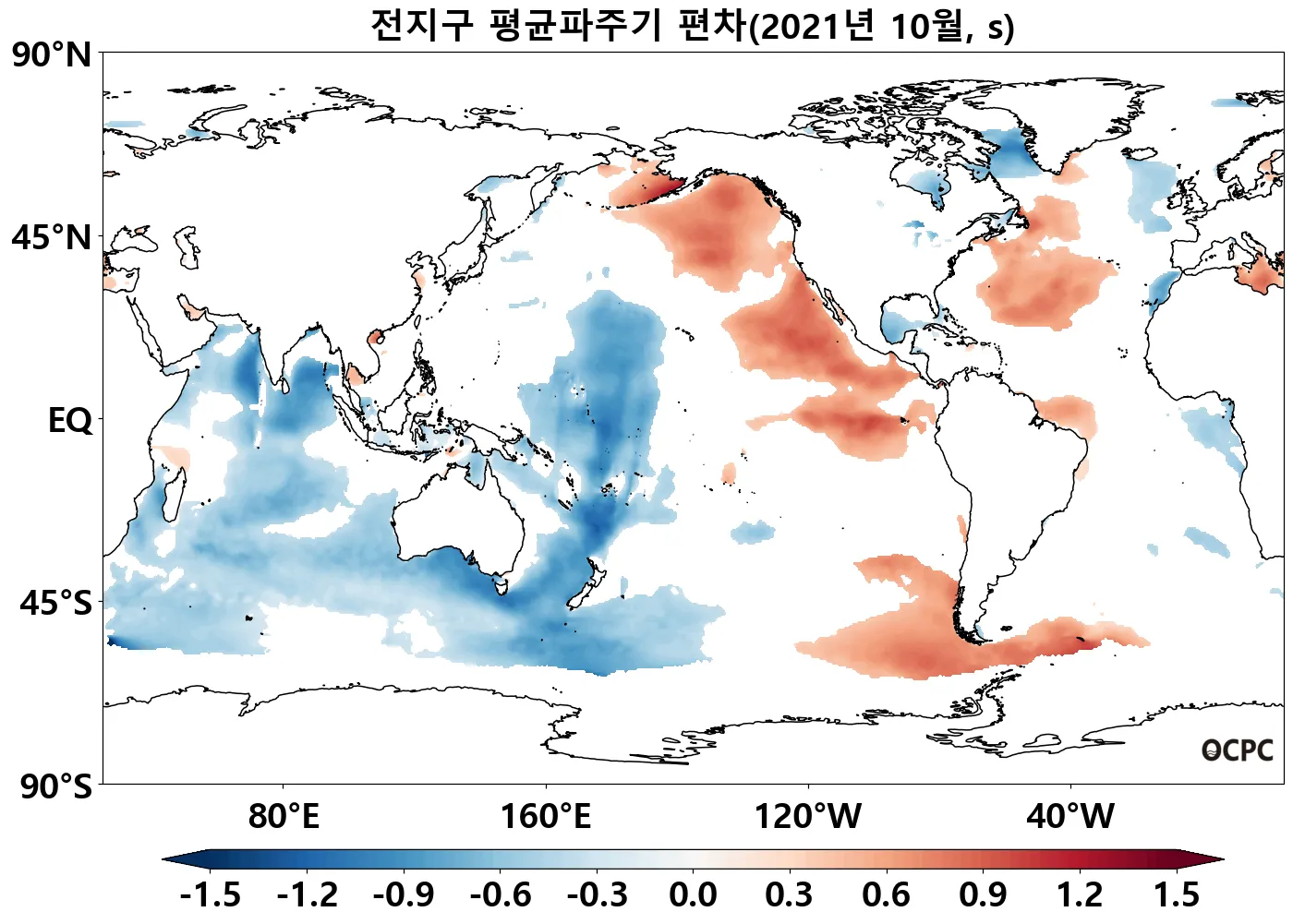 최근 30년 동안 10월의 전지구 평균파주기는 10년에 0.1초씩 감소하는 추세입니다.