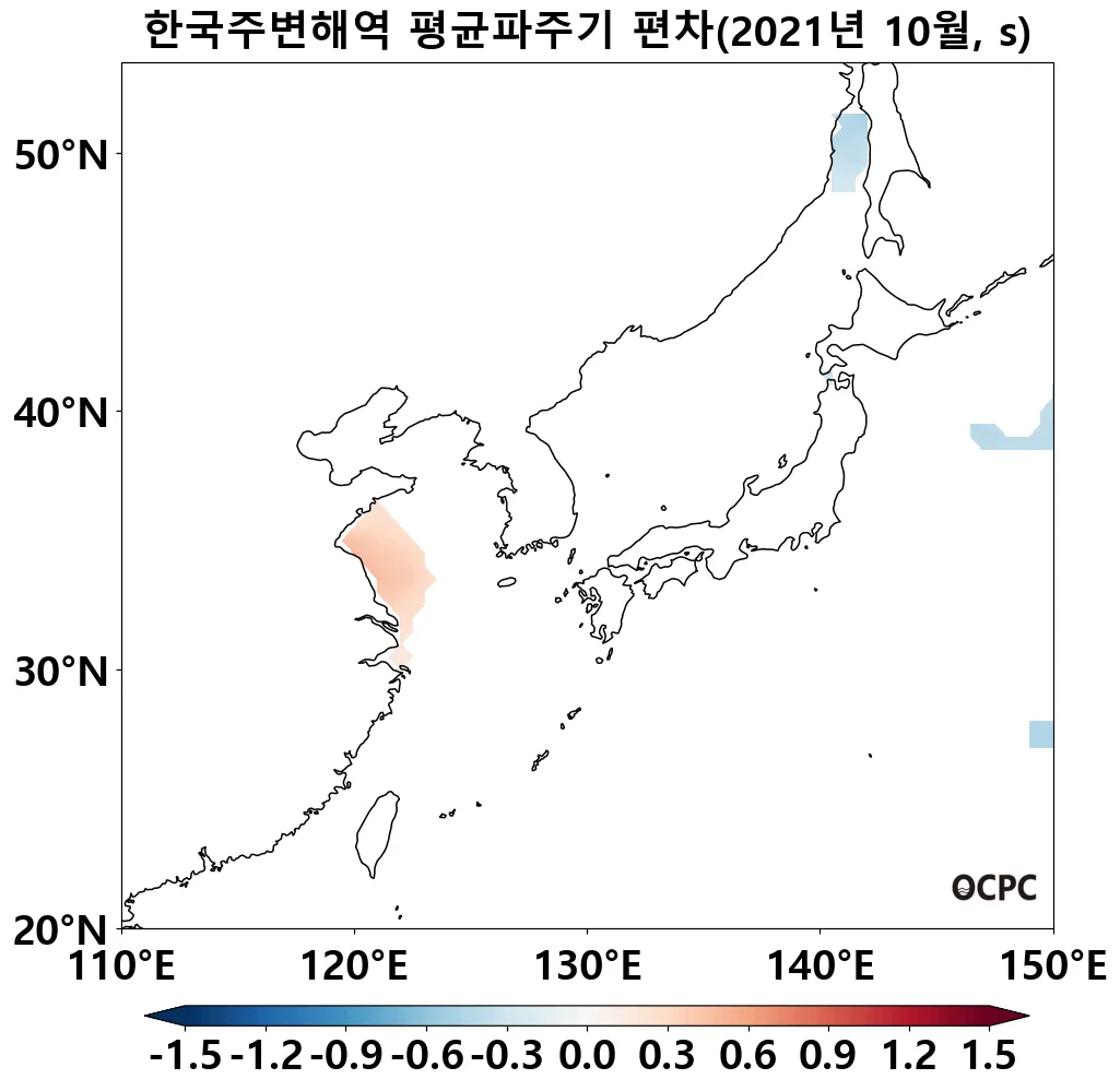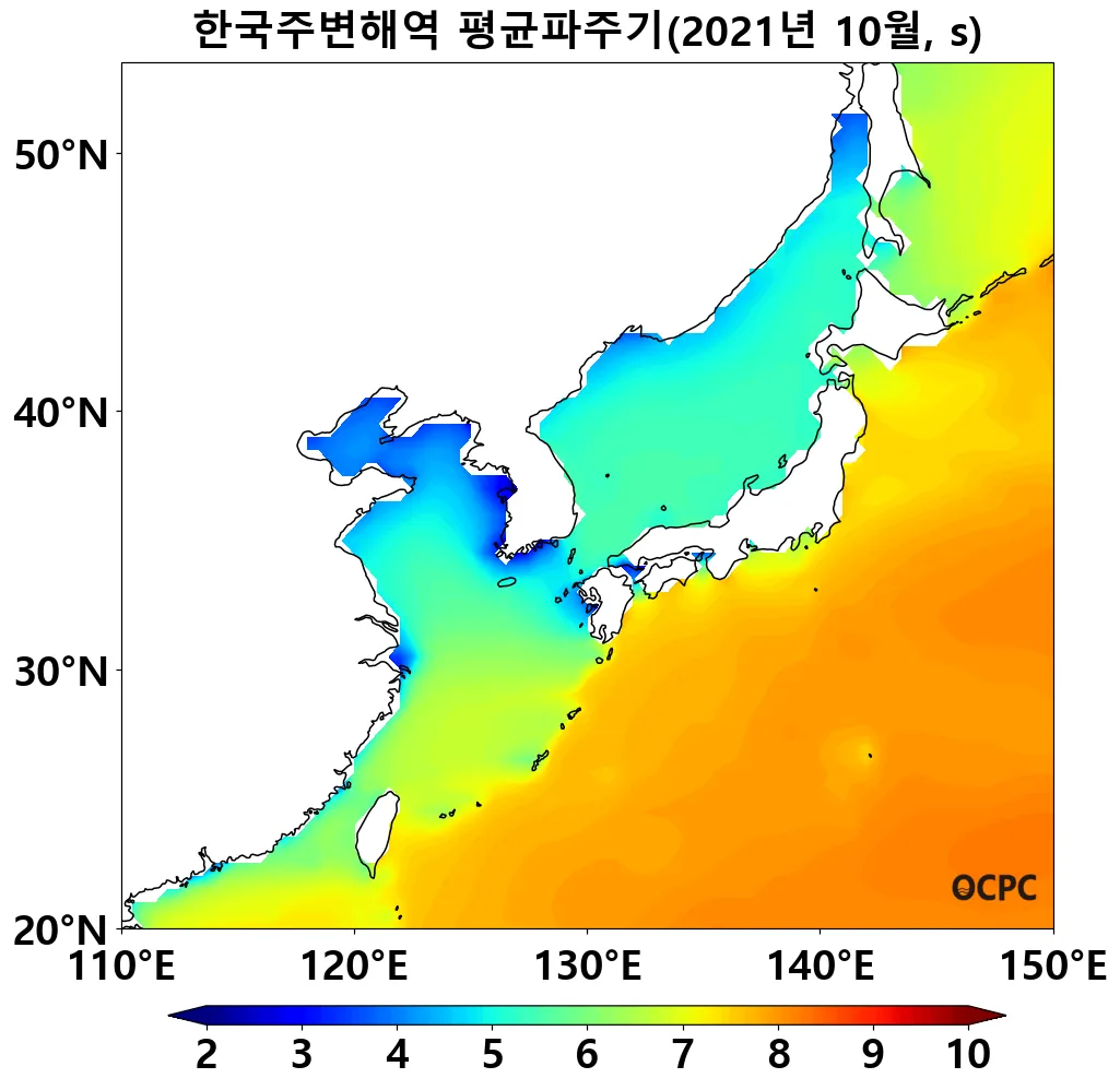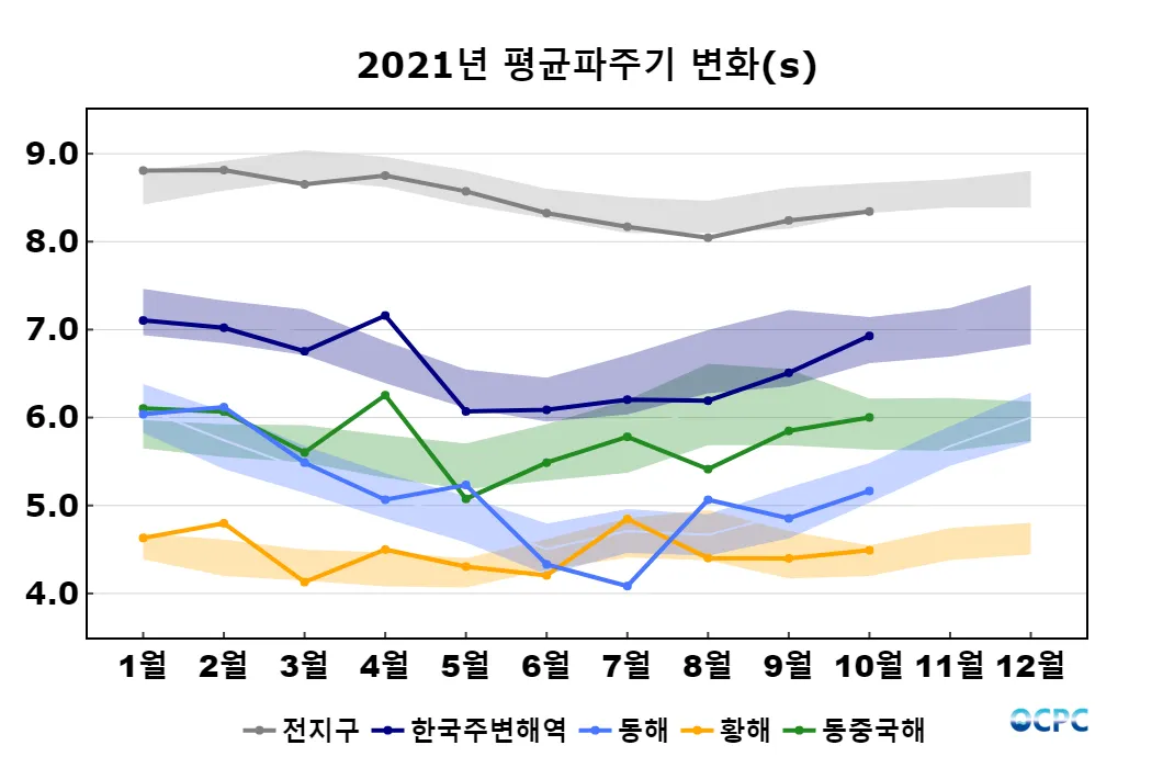 동해, 황해와 동중국해의 평균파주기는 평년(5.3초, 4.4초, 5.9초)과 비슷했습니다.