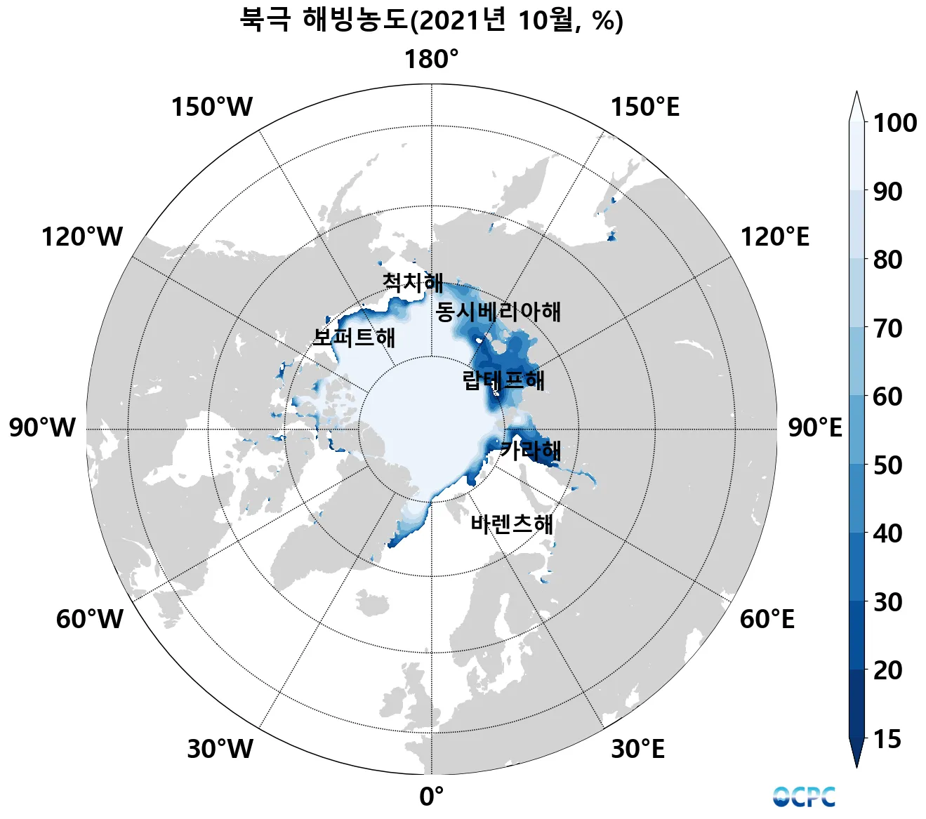 북극 해빙면적은 677만km²로 평년(835만km²)보다 158만km²(18.9%) 작았습니다.