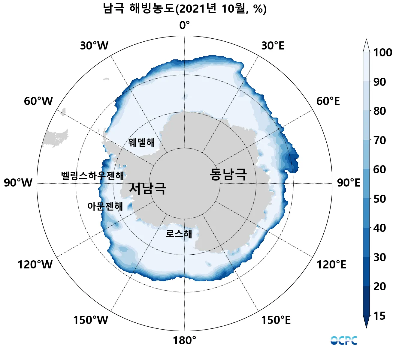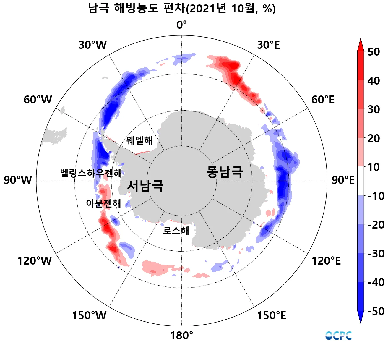 남극 해빙농도는 아문젠해와 동남극 섹터 서부에서 증가했고, 벨링스하우젠해, 웨델해, 동남극 섹터 중부에서는 감소했습니다.