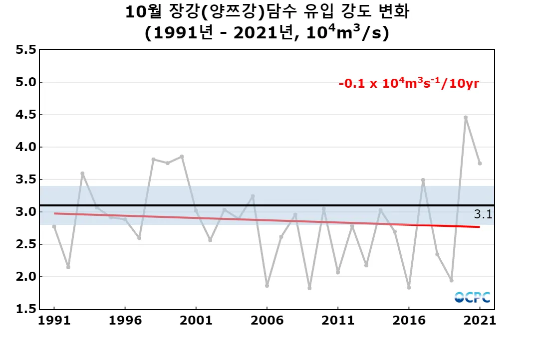 최근 30년 10월 장강 담수 유입 강도는 10년에 약 1,000m³/s씩 감소하는 추세입니다. 담수량으로 환산하면 10년에 약 2.7기가톤씩 감소하는 추세입니다.
