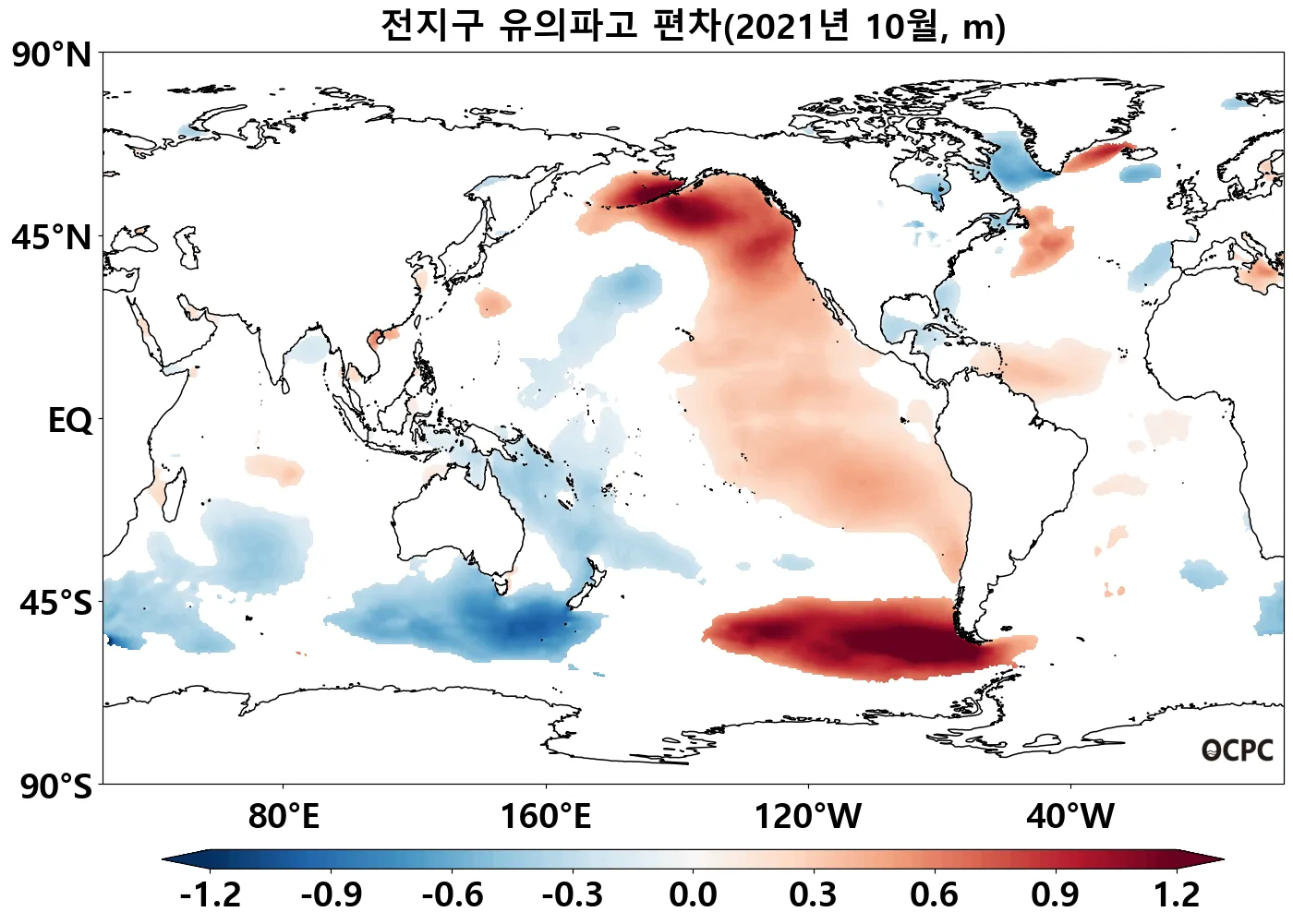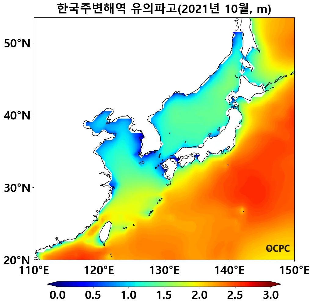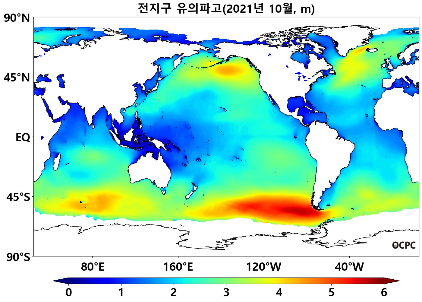 최근 30년 동안 10월의 전지구 유의파고는 10년에 0.6cm씩 낮아지고, 한국주변해역은 4.1cm씩 증가하는 추세입니다.