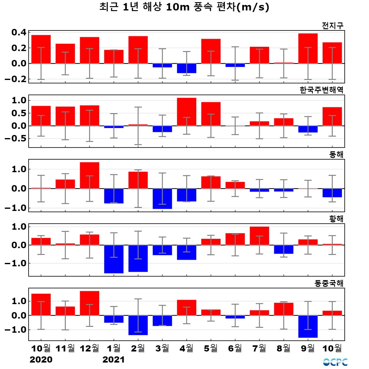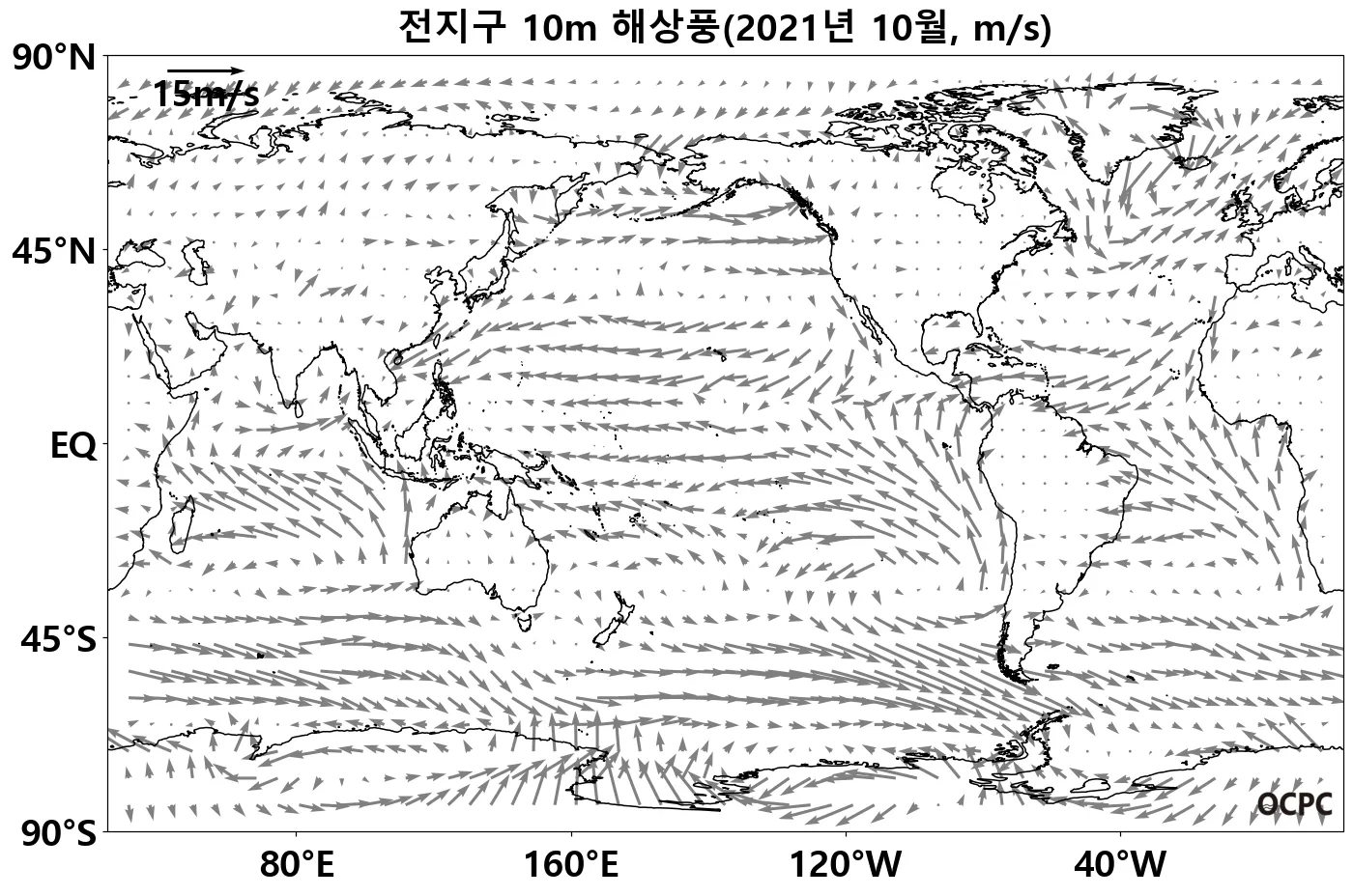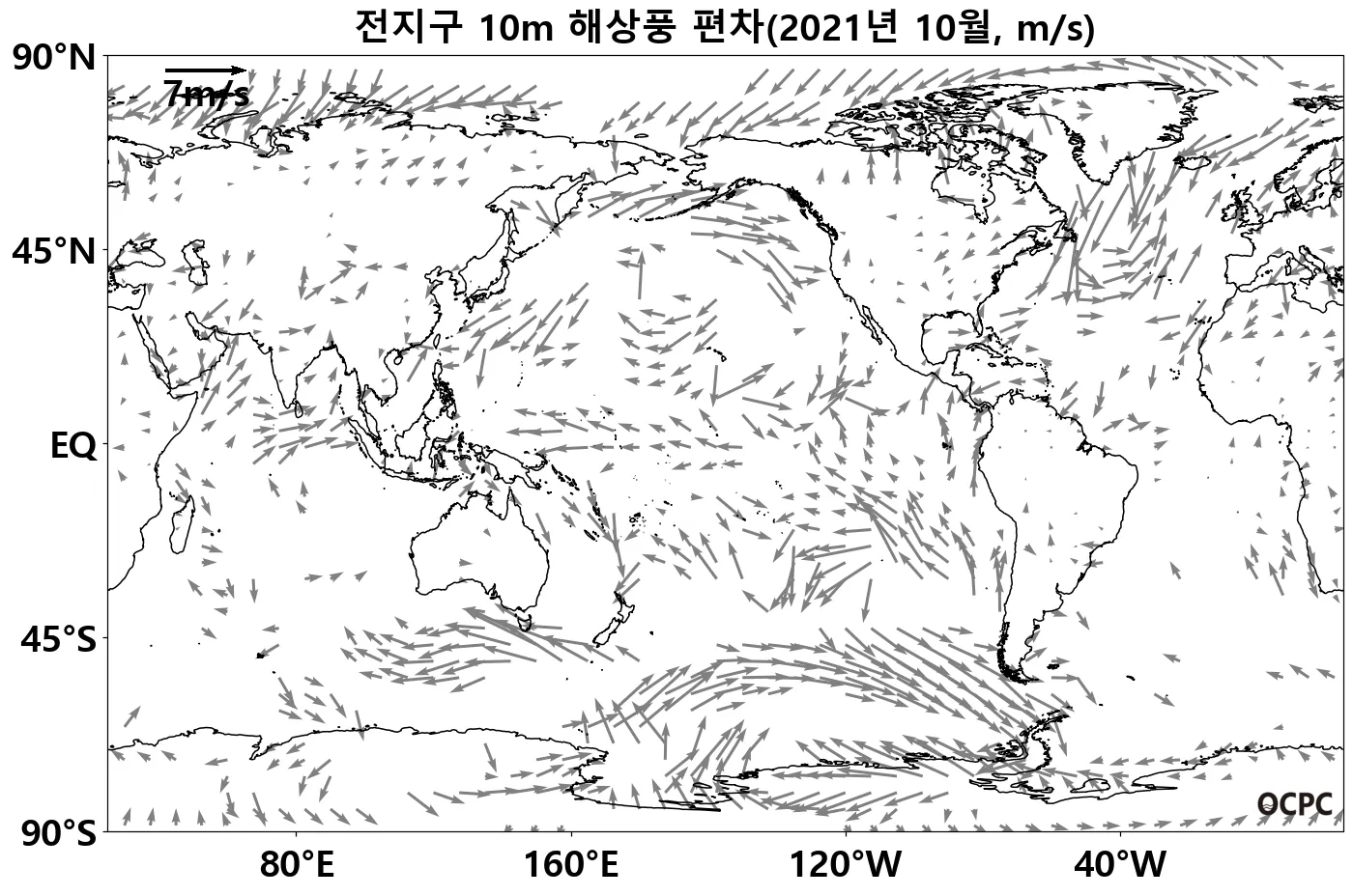 전지구 해상풍속은 평년(4.5m/s) 보다 0.3m/s(6.0%) 강했습니다.