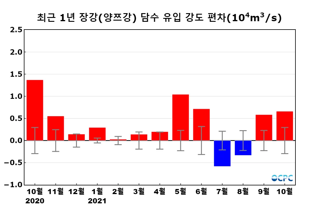 중국 장강(양쯔강)으로부터의 담수 유입량은 평년보다 21.3% 많았습니다.