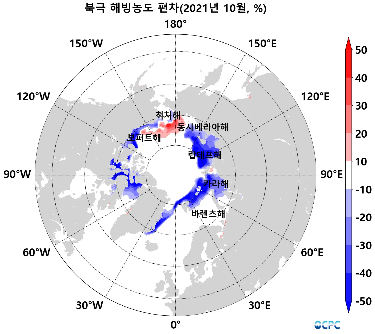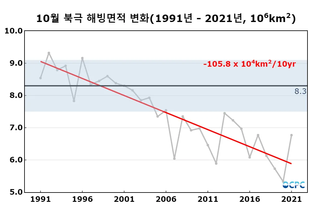 최근 30년 동안 10월 북극 해빙면적의 경향은 10년에 106만km² 정도의 감소 추세에 있습니다.