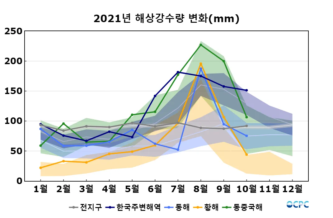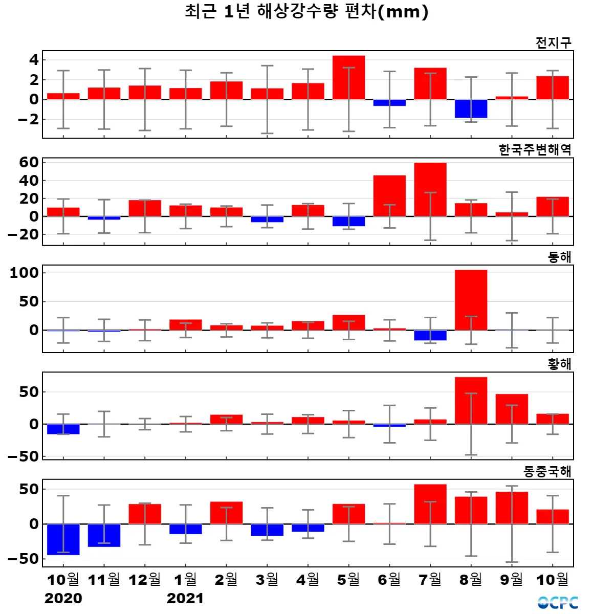 전지구, 동해, 동중국해의 10월 해상강수량은 평년과 비슷했으며, 한국주변해역, 황해는 평년보다 많았습니다.
