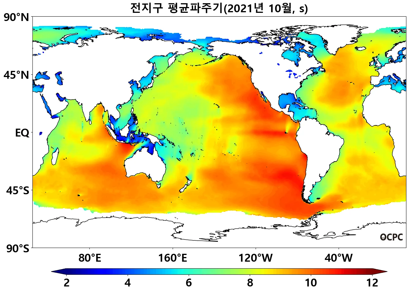 전지구 및 한국주변해역의 평균파주기는 평년(8.5초, 6.9초)과 비슷했습니다.