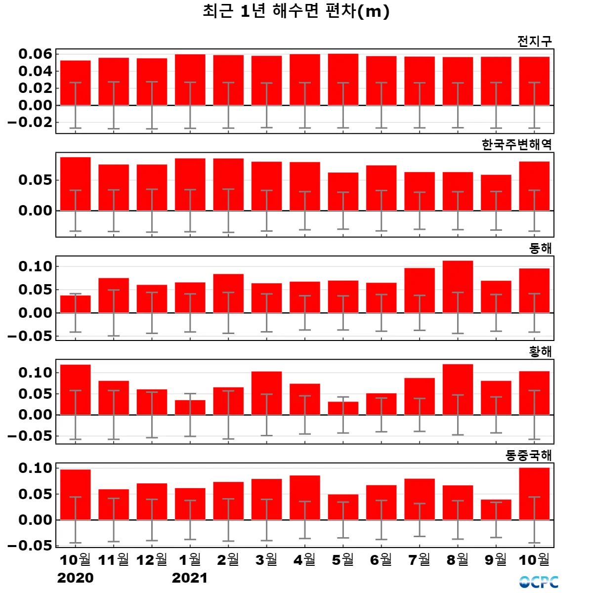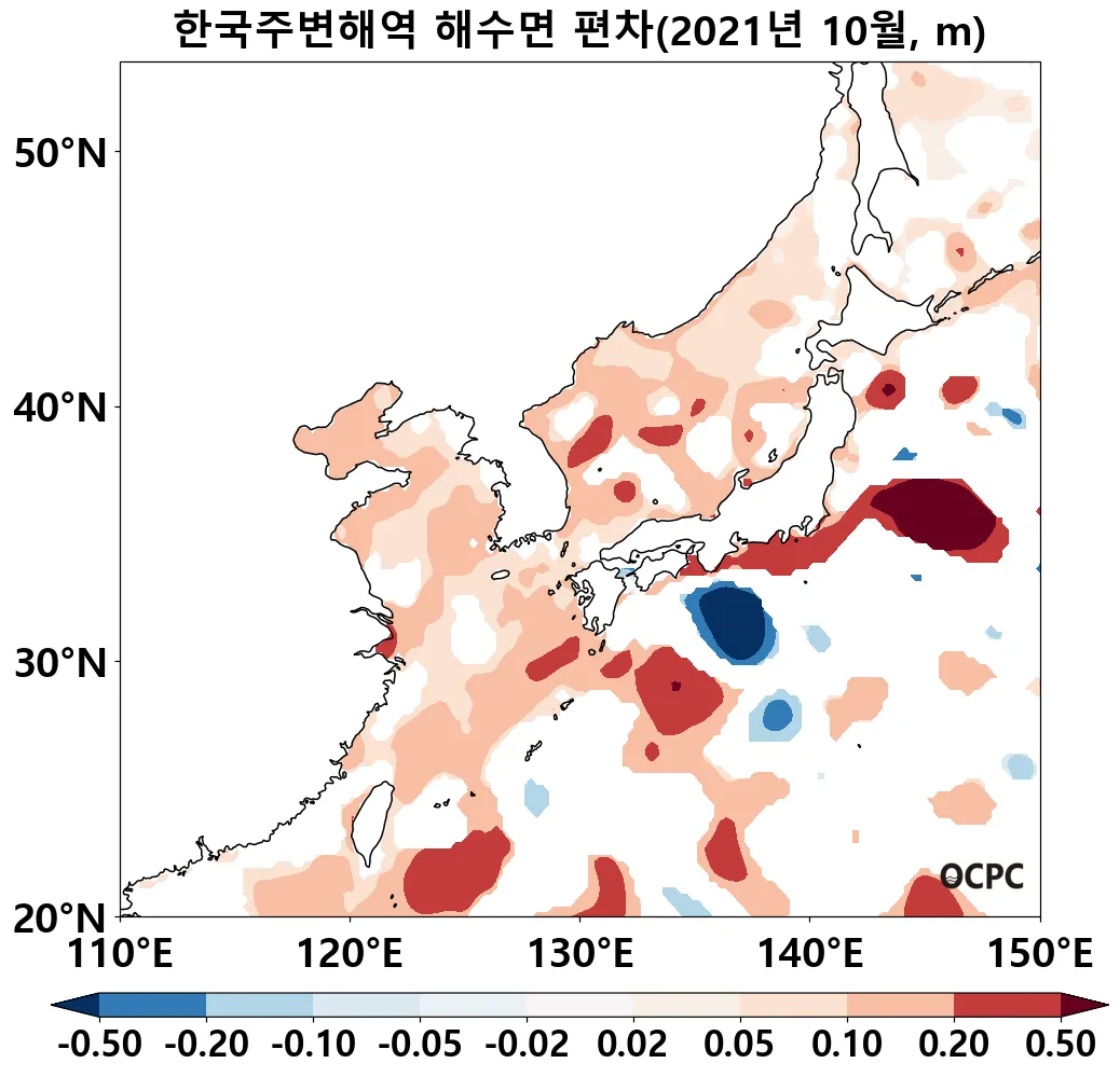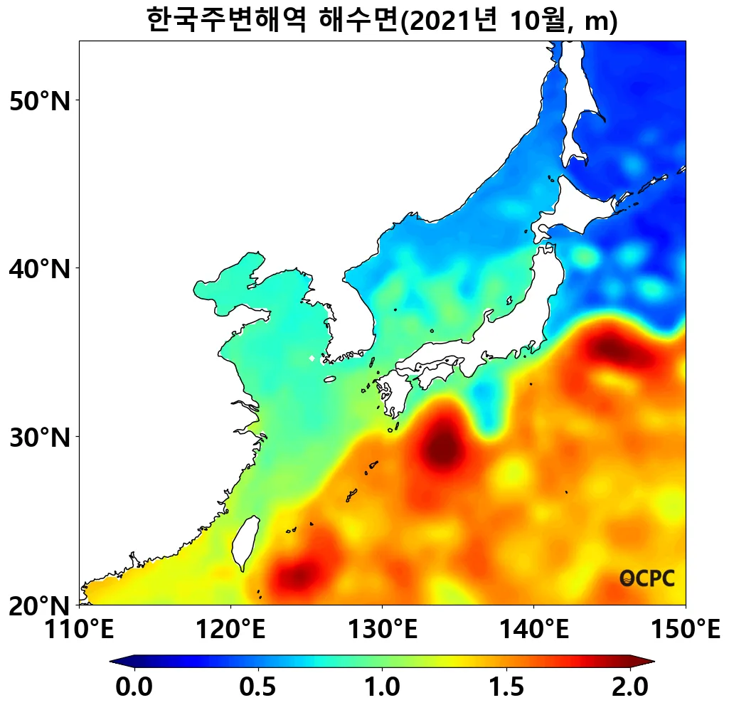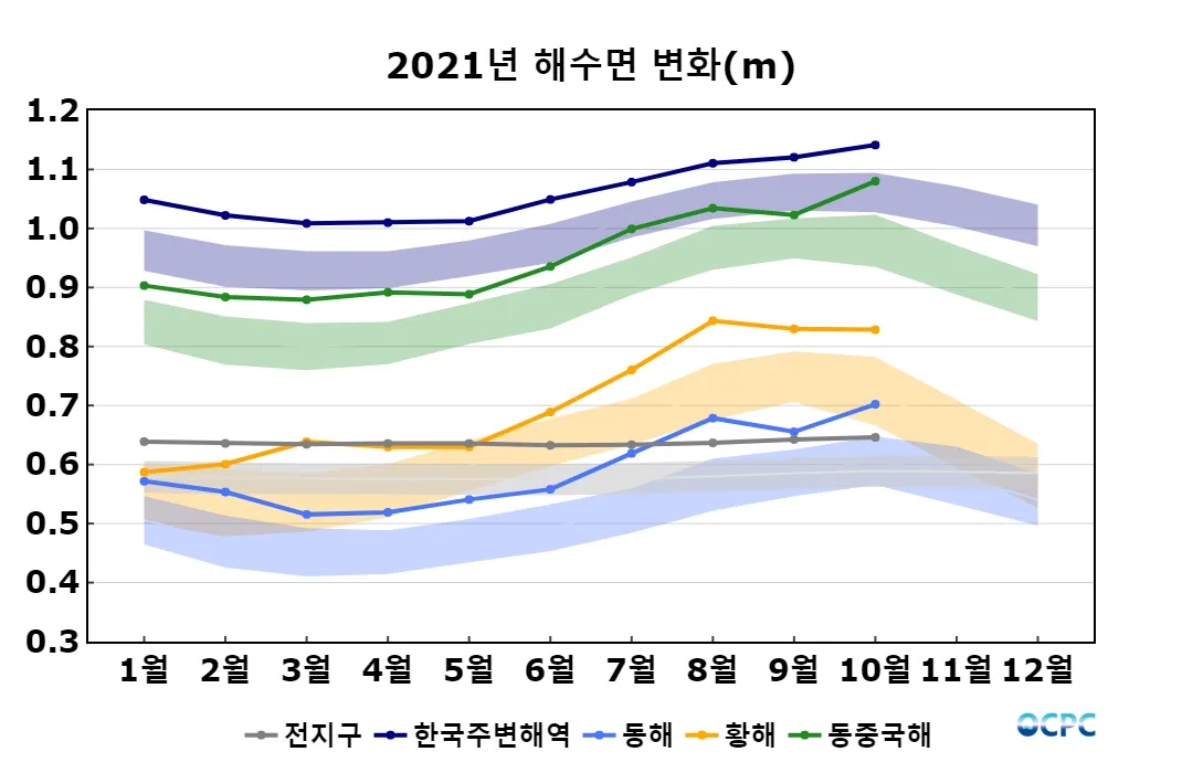 한국주변해역 평균 해수면은 평년보다 8.1cm 높았고, 동해, 황해, 동중국해는 평년보다 각각 9.6cm, 10.1cm, 10.4cm 높았습니다.