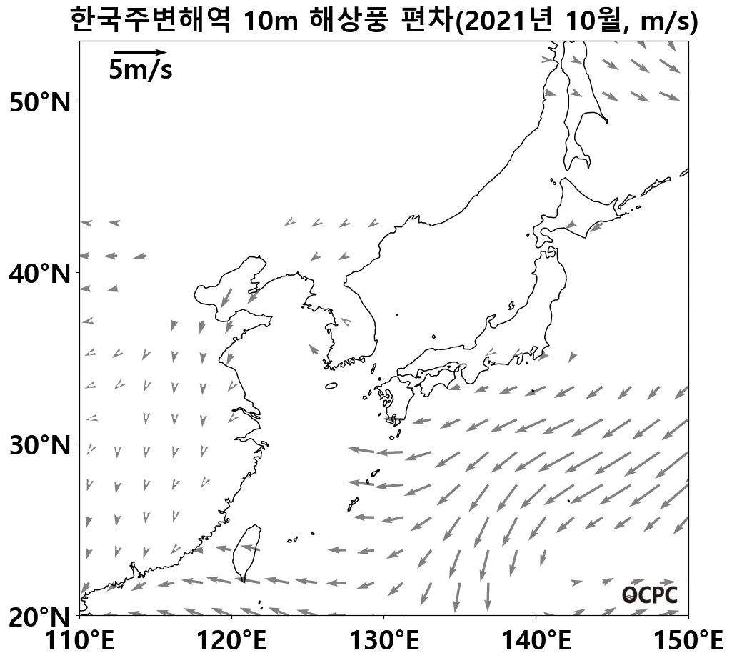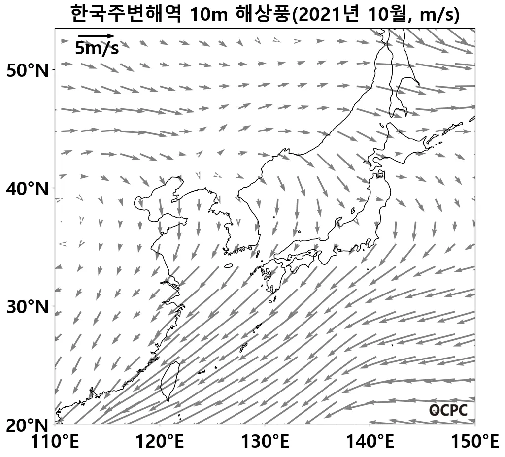 최근 30년 동안 한국주변해역, 황해, 동중국해의 10월 해상풍속은 10년에 0.1~0.2m/s씩 증가하는 추세입니다.
