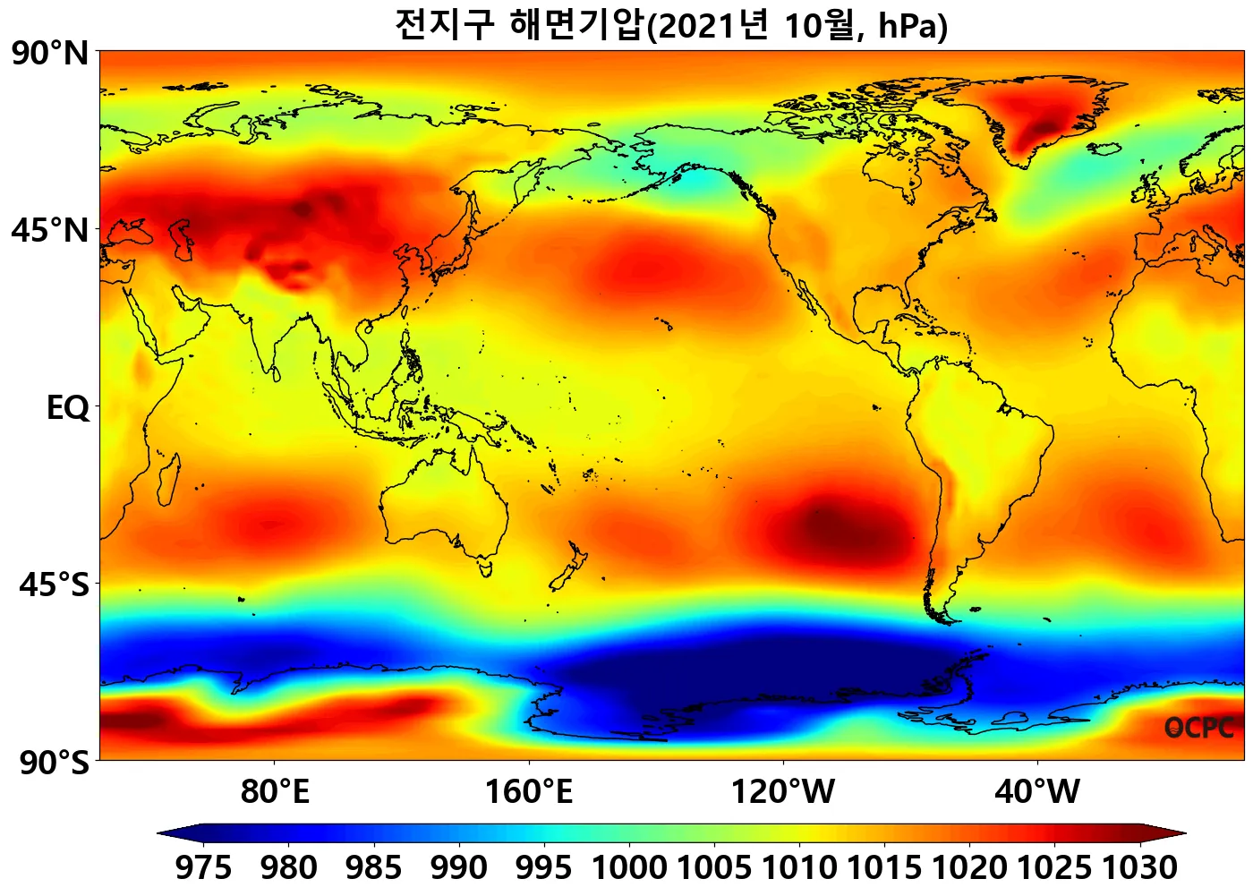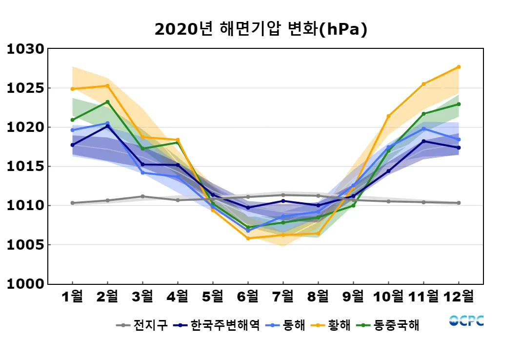 전지구, 동중국해의 해면기압은 평년과 비슷했으며, 한국주변해역, 동해, 황해는 평년보다 높았습니다.